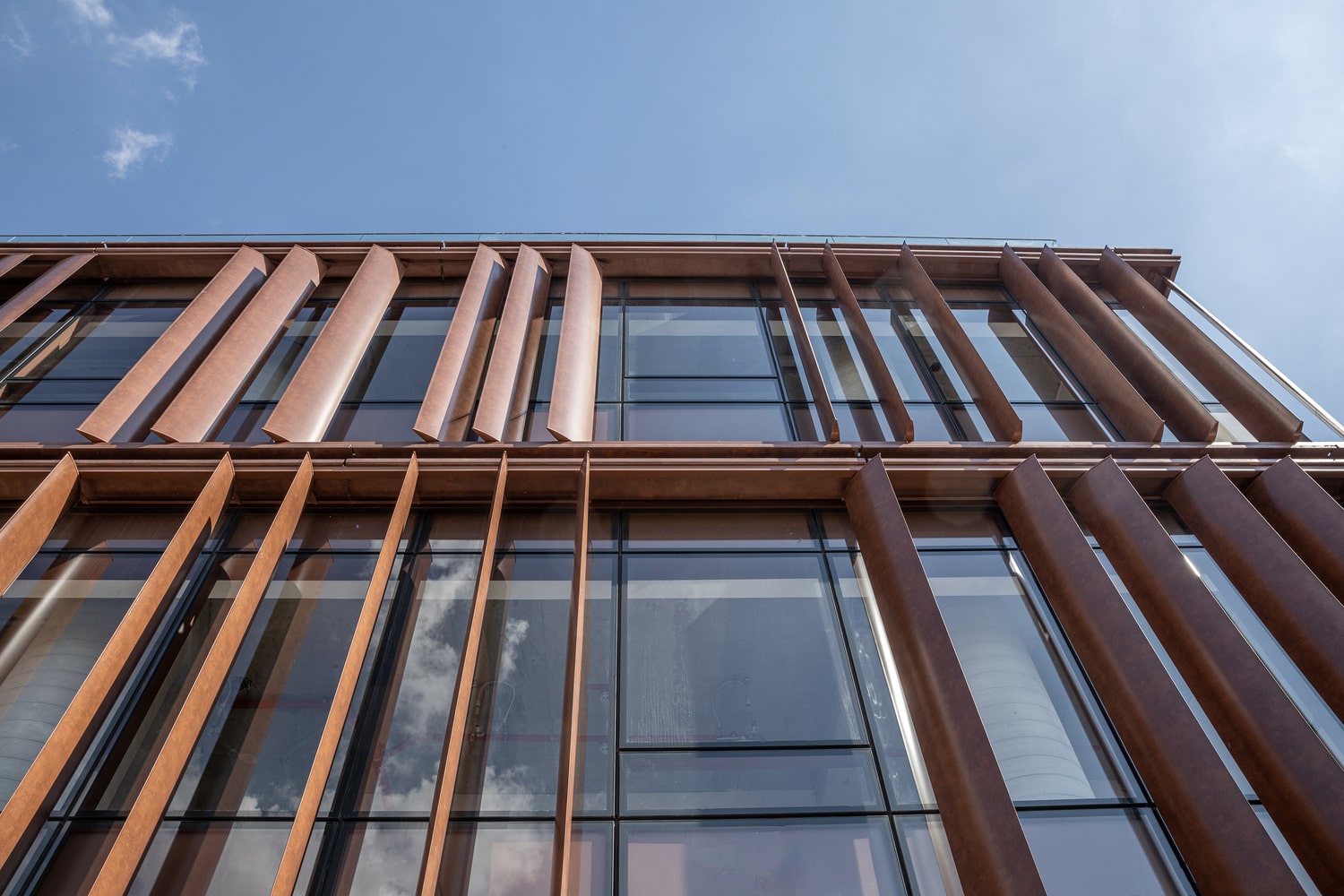 Vertical metal fins animate the façade in a measured rhythm, shielding expansive glazing that floods the interior with natural light. Landscaping plays a central role, enhancing the garden spaces and reinforcing the project’s nature-centric philosophy.
