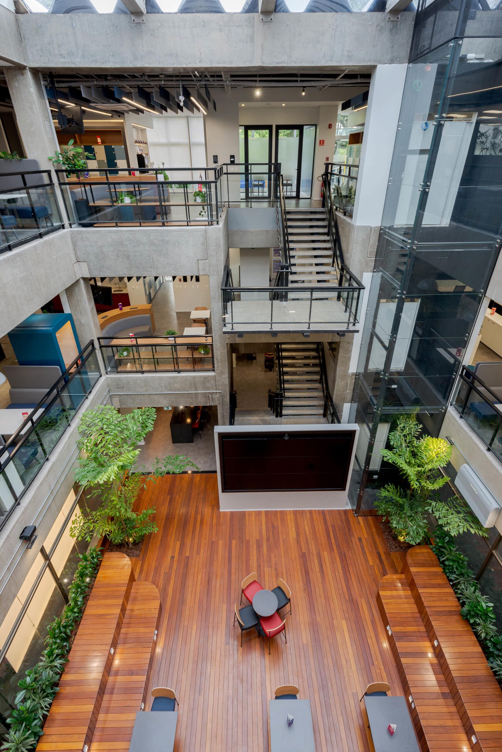 The previously underutilized central arena has been transformed into a lively gathering point for internal announcements, presentations, and social events. A large videoconferencing screen supports hybrid interactions, and the space is anchored by two impressive palm trees and a selection of tropical plants, creating an atmosphere that is both energizing and serene.