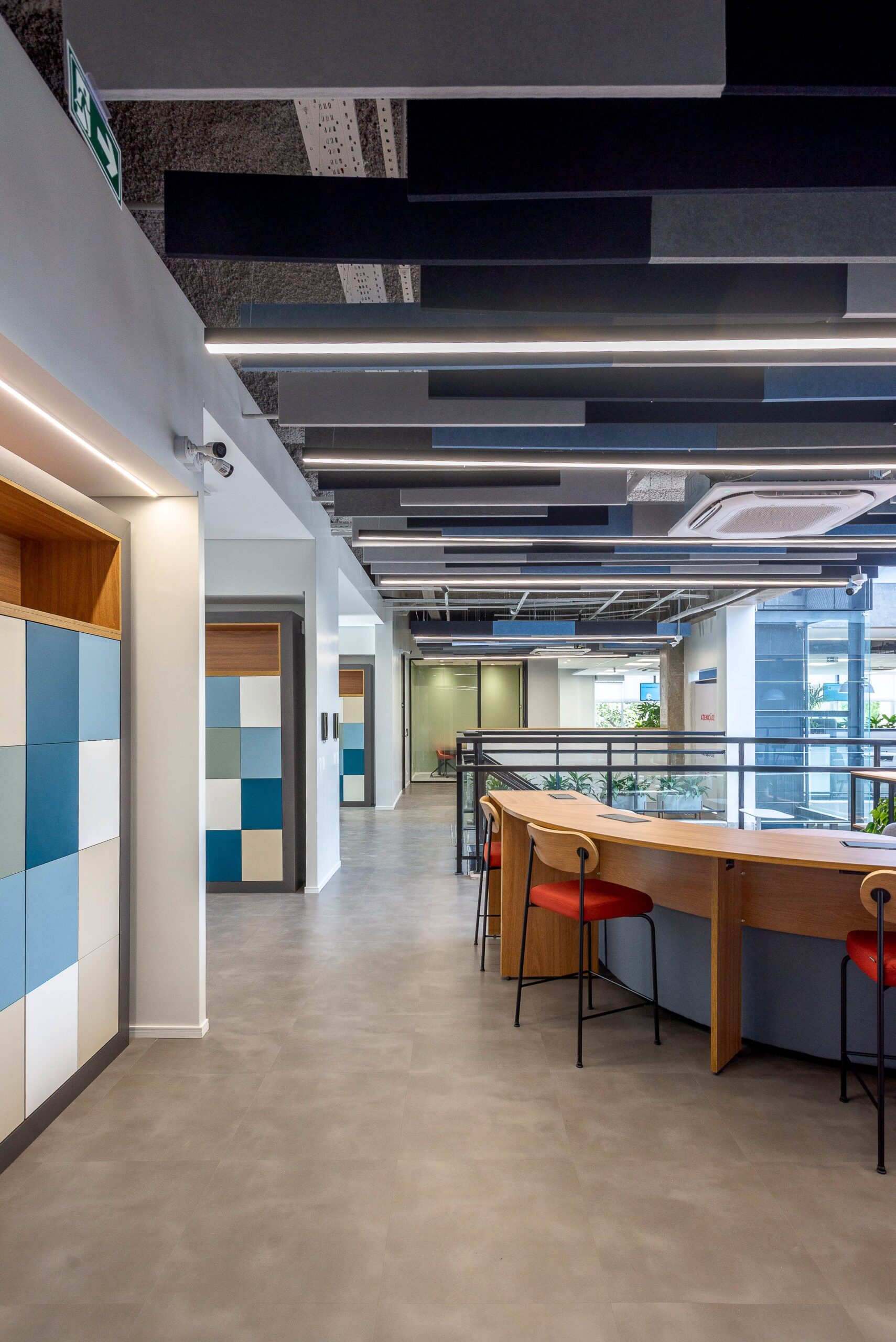 Attention to acoustics and privacy was also a major focus. Acoustic panels and carpeted flooring minimize sound disruptions in shared areas, ensuring more comfortable interactions. In spaces requiring discretion, smart glass technology was implemented, allowing glass walls to switch from transparent to opaque with a simple command—balancing openness and confidentiality as needed.
