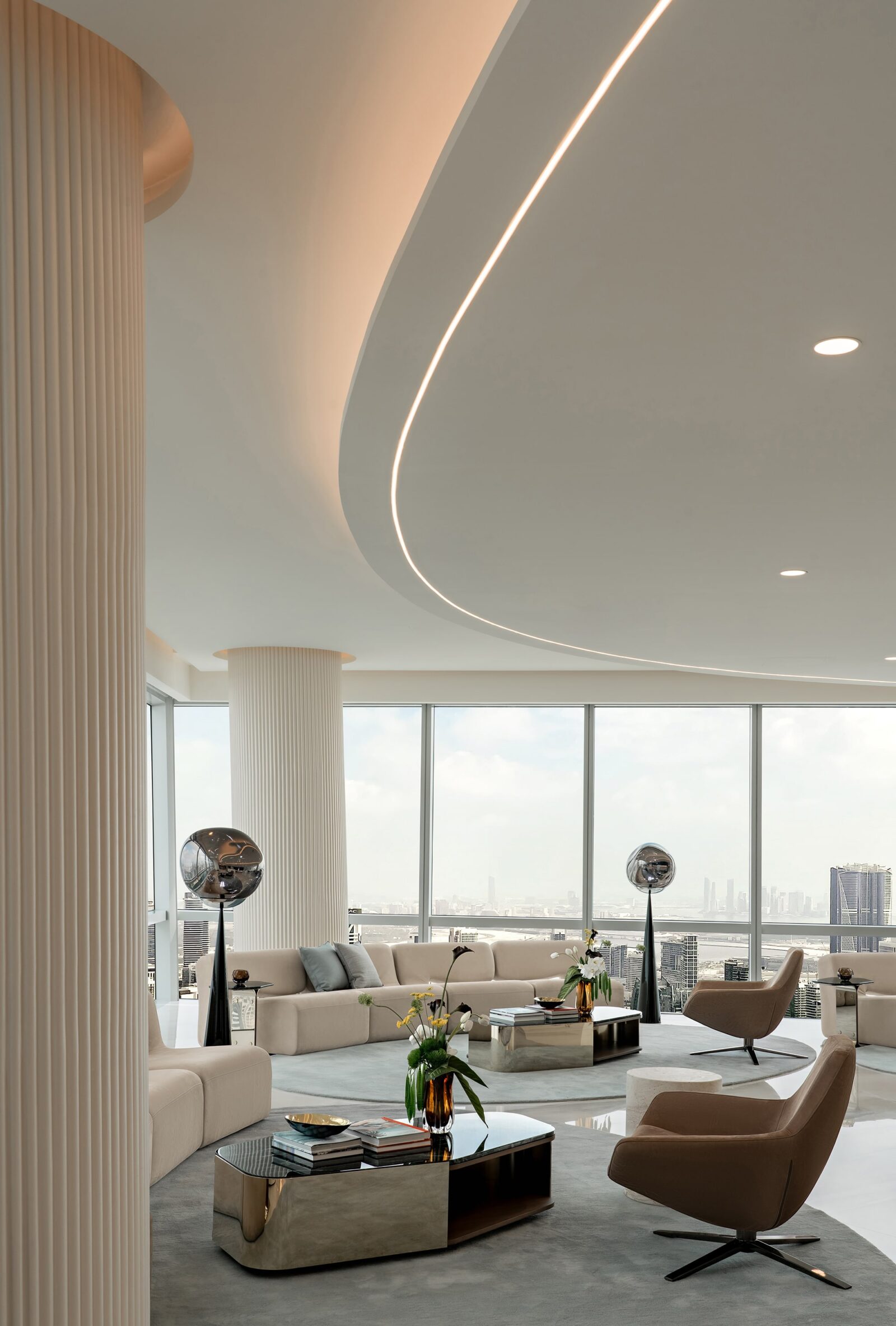 This grand-scale space transcends mere modernism—it’s a spatial experiment that intertwines history and the future. The design artfully integrates the proportions and craftsmanship of classical architecture with the sleek minimalism of modern design, creating an unadorned space imbued with classical solemnity. The curated color palette resonates with the dynamic tension of the surrounding cityscape, subtle yet powerfully expressive.