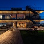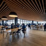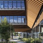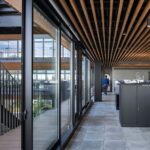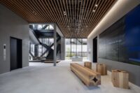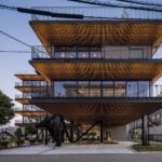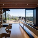 The structure employs a steel frame with a full-glass façade, complemented by wrap-around balconies that function as environmental buffers and outdoor refreshment areas. Pinewood louver ceilings extend seamlessly from interior spaces to the exterior eaves, concealing mechanical equipment while imparting the warmth of natural materiality. These wood elements evoke the underside of traditional shrine roofs, and at night, deck lighting highlights the intricate patterns, creating a visually rich and inviting atmosphere. The piloti ceiling louvers reference the hulls of Kitamae trading boats, reinforcing a subtle narrative that connects the building to Toyama’s historical trade and maritime culture.
