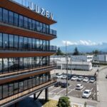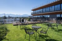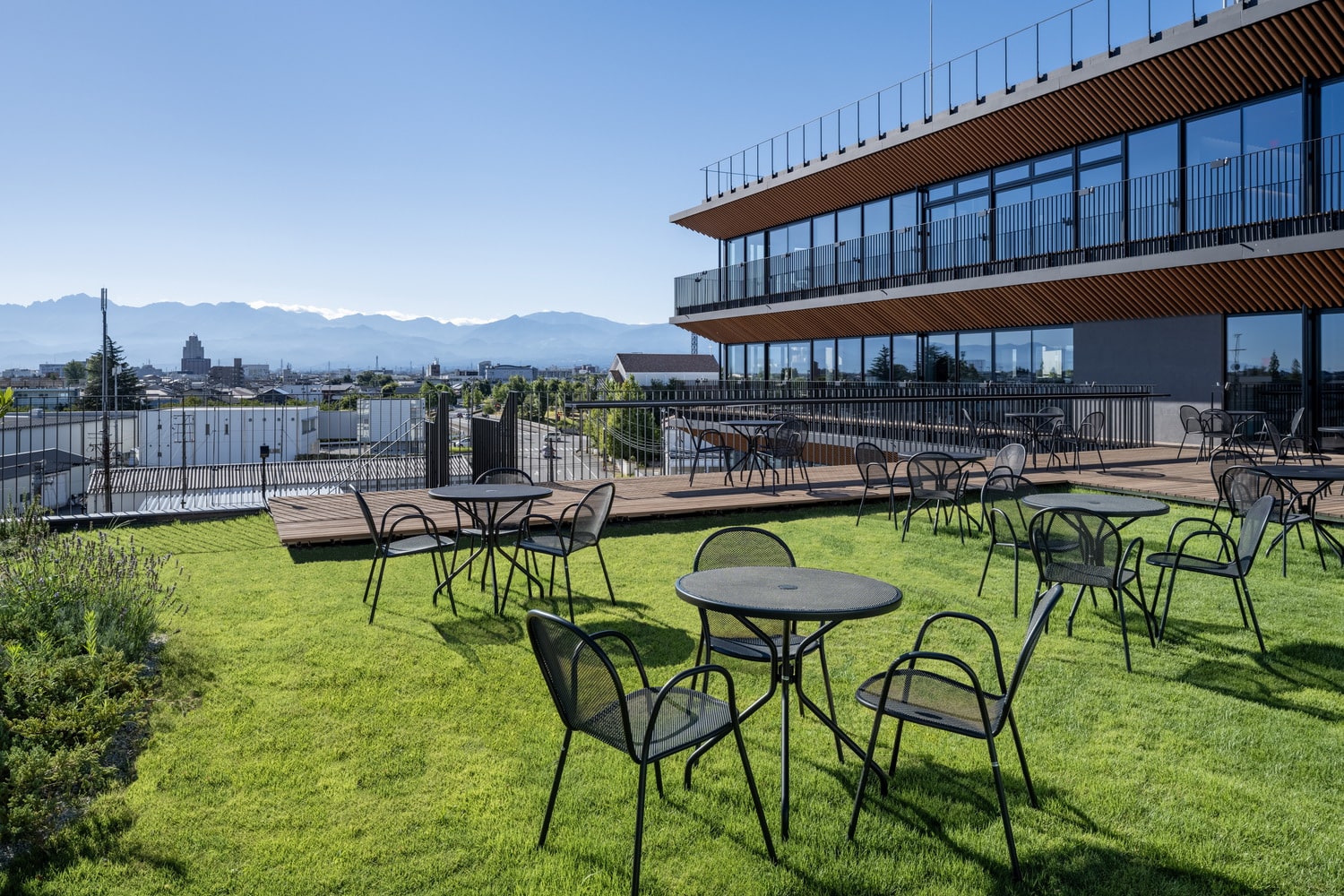 The design integrates a responsive and functional landscape strategy. Beneath the raised floors, green areas featuring medicinal herbs and local trees are irrigated using underground alpine water, which also supports snow-melting systems in winter. These landscaped spaces connect directly to the adjacent park, encouraging both employees and the public to engage with the site. Balconies and terraces contribute to passive climate control, providing shading from summer sun, allowing low-angle winter light, and enabling natural ventilation with prevailing breezes. Together, these strategies create a workplace that is comfortable, sustainable, and closely aligned with its natural context.