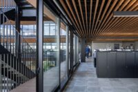 The Juzen Chemical Corporation Head Office, designed by KEY OPERATION INC., is a modern architectural intervention that unites operational efficiency, employee well-being, and contextual sensitivity. Founded in 1950 in Toyama City, Juzen Chemical is a contract manufacturer of active pharmaceutical ingredients. The company’s decision to consolidate its dispersed offices, meeting spaces, and cafeteria into a single headquarters presented an opportunity to create a workplace that not only functions efficiently but also responds to the local environment, culture, and history. Situated between the Jintsu River and the Fugan Canal within an industrial park, the site is both strategically positioned and visually connected to Toyama’s distinctive natural and cultural landscape.
