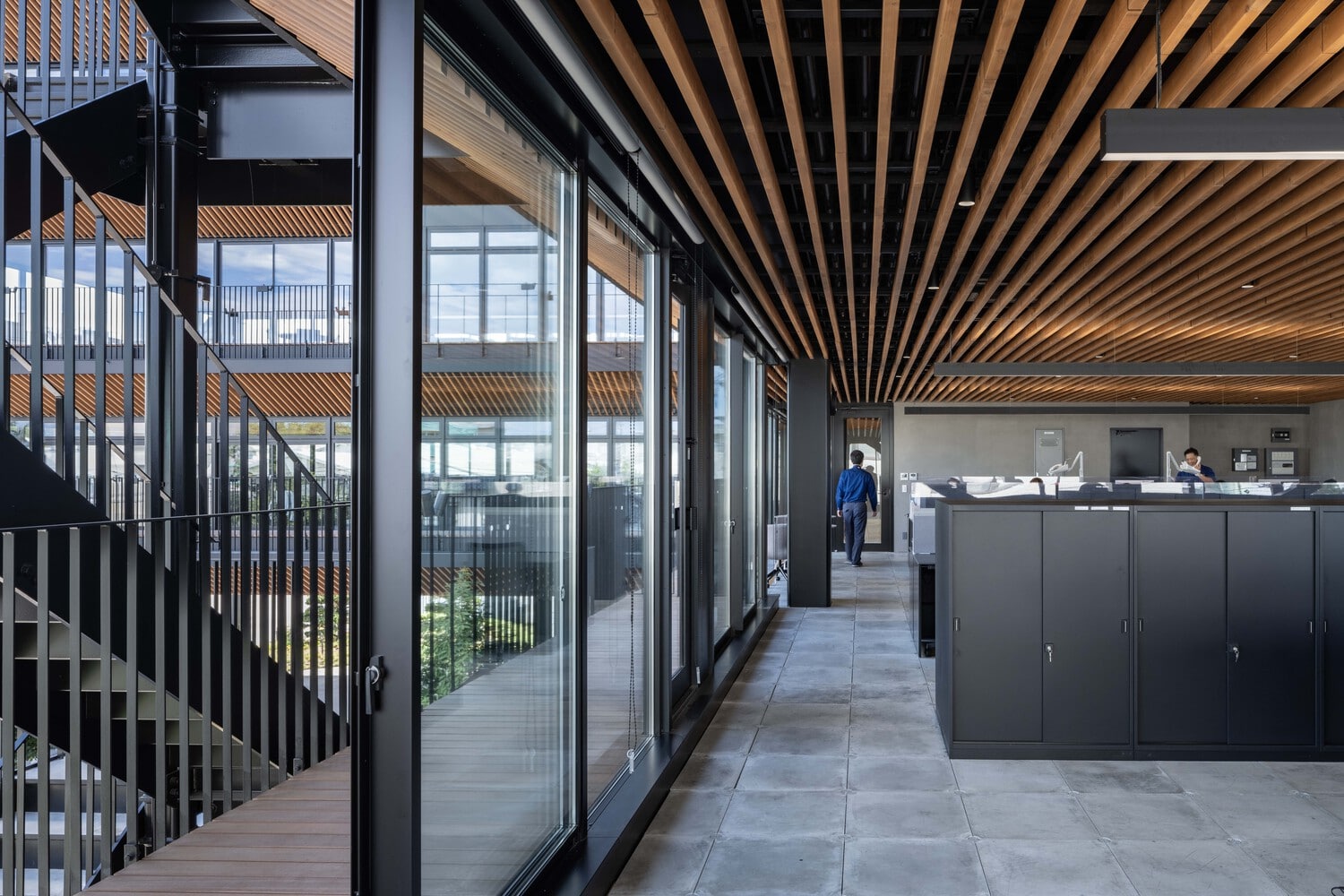 The architectural concept was informed by extensive employee workshops involving staff across departments and generations. These discussions highlighted Juzen Chemical’s deeply rooted culture of spontaneous communication, alongside a desire for spaces that allow concentration and focused work. Responding to this dual need, the design orchestrates a seamless shift between solo work, collaboration, and informal social interaction. Inspiration was drawn from Toyama’s natural landscape, particularly the Tateyama mountain range, as well as from the historic Kitamae trading boats, which once transported medicinal ingredients from Toyama to other regions. These references are embedded in the design language, creating a building that resonates both symbolically and experientially.