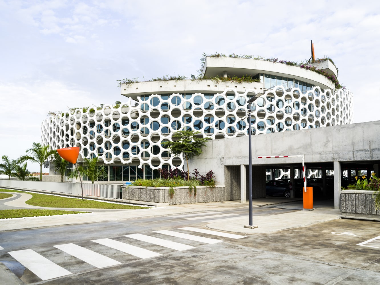 Rather than imposing itself as an isolated object, the building is conceived as a natural extension of the surrounding vegetal axis. Positioned by the lagoon, it establishes a visual and spatial dialogue with the landscape, reinforcing a sense of continuity between architecture and nature. The circular form also organizes internal circulation intuitively, fostering fluid movement and visual connections across floors.
