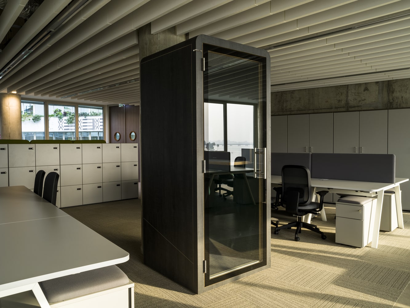 The ground and garden levels host shared functions that reinforce collective life: a conference center, training and meeting rooms, a restaurant, and a gym. These spaces are designed to encourage cross-departmental interaction and support a dynamic working culture. Above, the office floors combine individual offices, flexible co-working areas, and small meeting rooms, allowing employees to choose environments that best suit their tasks while maintaining visual openness and adaptability.