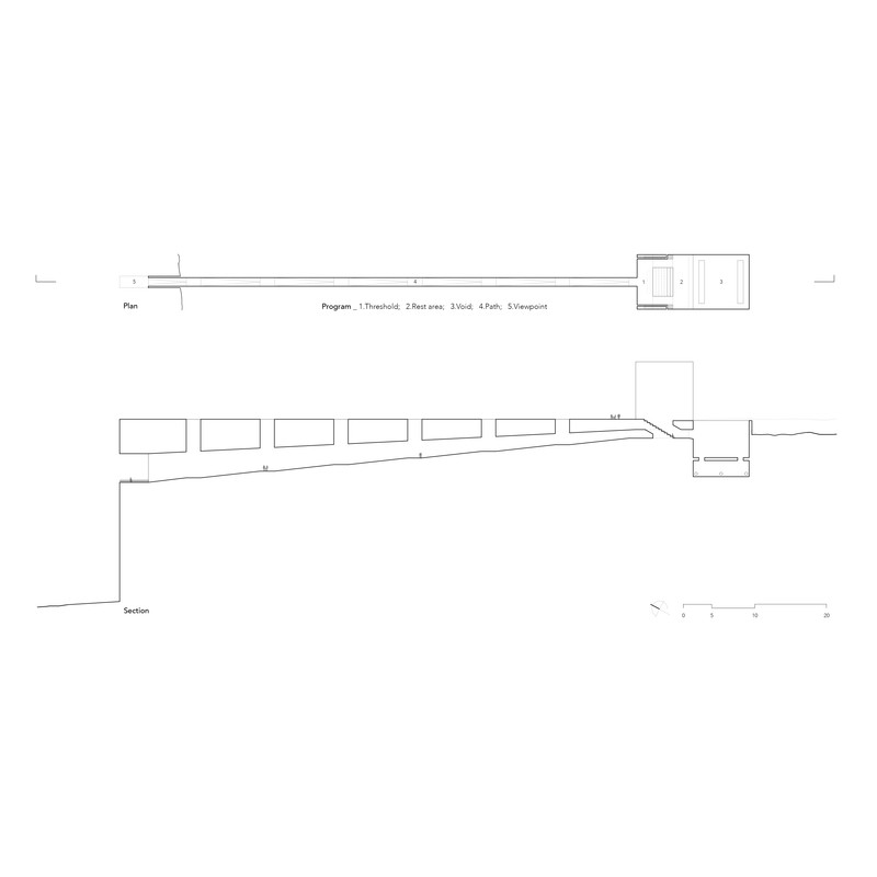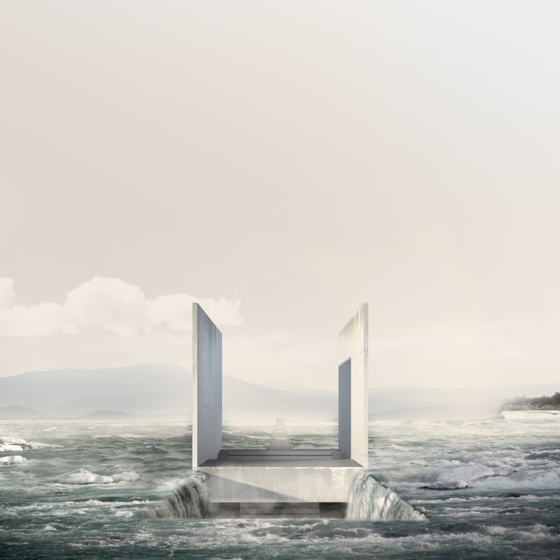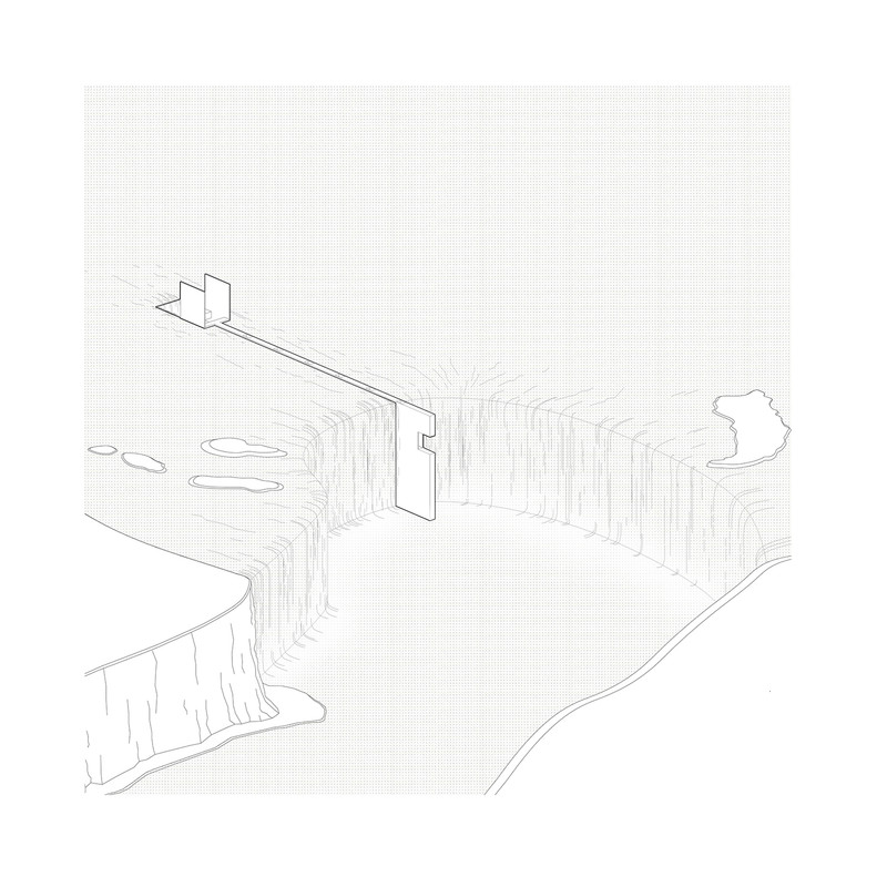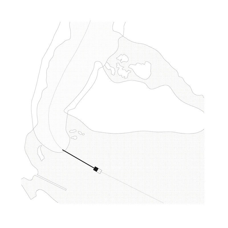 A path on the water, accessible by ferry, takes you to a platform in the middle of nowhere. This path makes real the border, both parts are connected by a zip.