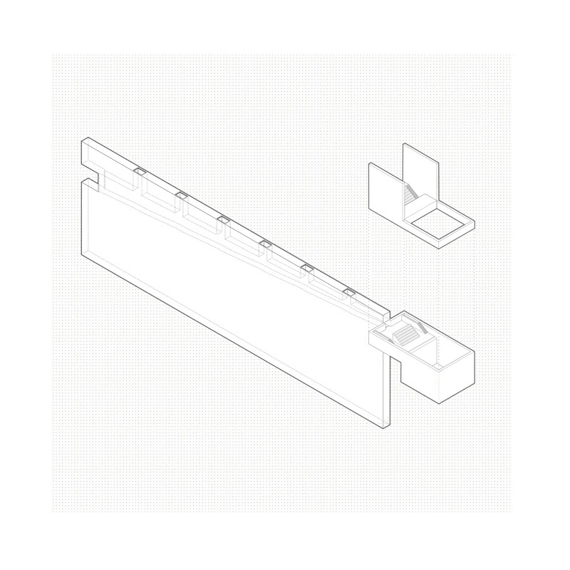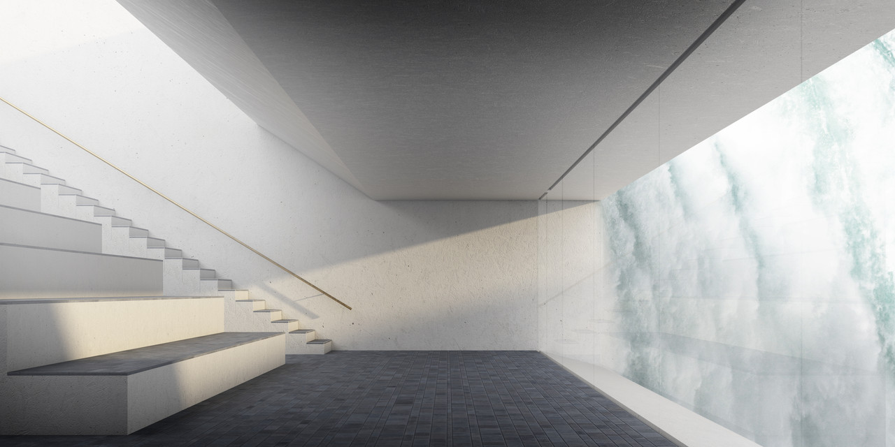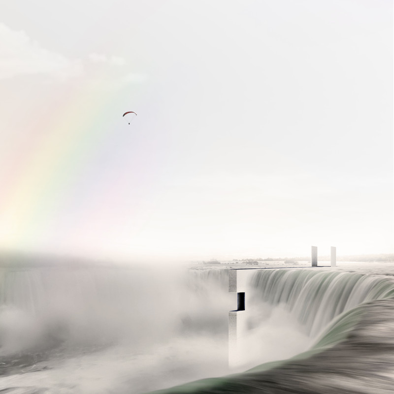 A stairway takes you under the platform, in a hidden space facing a void where the water falls. Each side of the void represents one of the Niagara Falls.