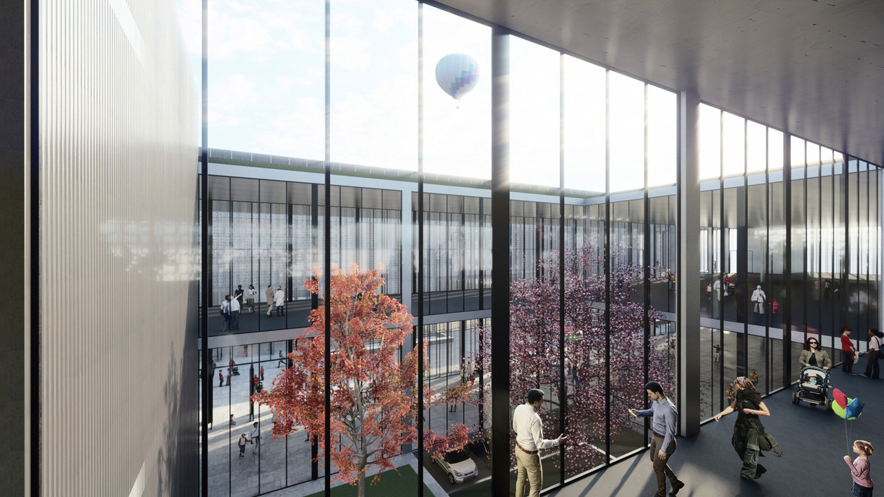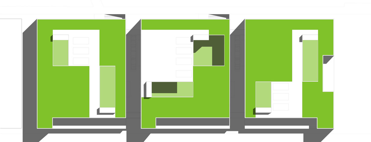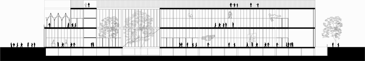 The scale and depth that the building takes makes it necessary to incorporate internal ventilation courtyards which also generates balconies between the different levels of the pavilion. Terraces are incorporated in the three blocks of equal size and scale, reinforcing the link between the boulevard and the views towards the bridge and access to the property.