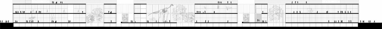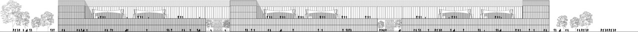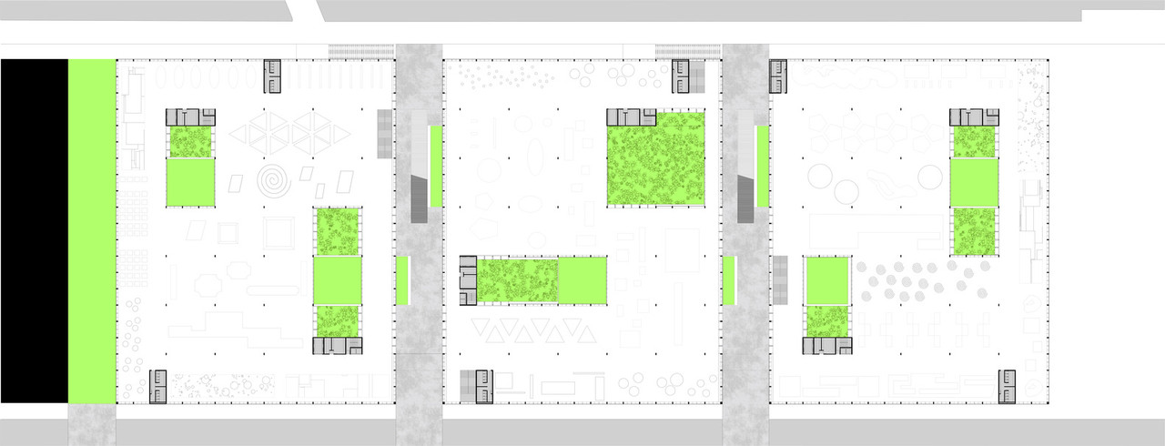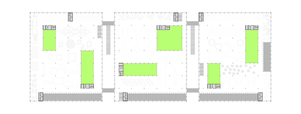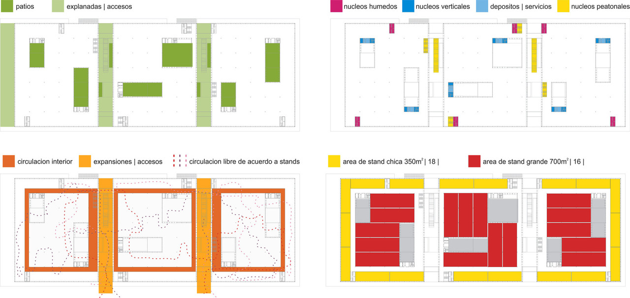 A 15m x 15m structural grid organizes everything, releasing large lights by using relieved slabs. This decision takes into account the necessary modulation for surfaces intended for stands, circulations, parking lots, future offices and yards. A large perimeter ring contains the main structure, the joinery and the enclosure shutter that regulates the solar control. This modulation, that looks very rigid, allows to arrange in a disorganzed manner courtyards, spaces for stands and services, configuring virtual and indefinite routes, accentuating a perception of constant spatial change. In the future, a submodule of 5m x 5m materialized with dry construction technology will solve the legacy stage.