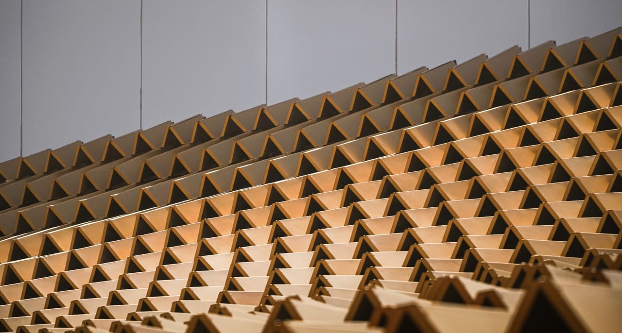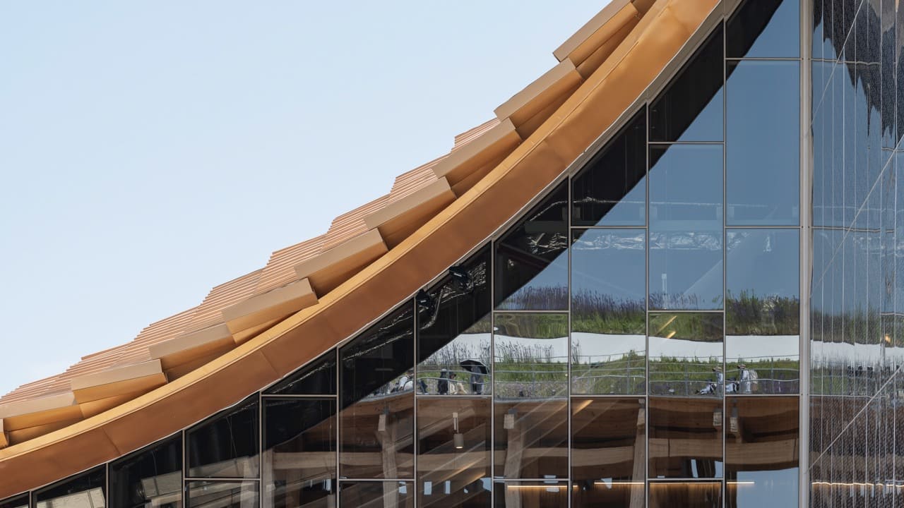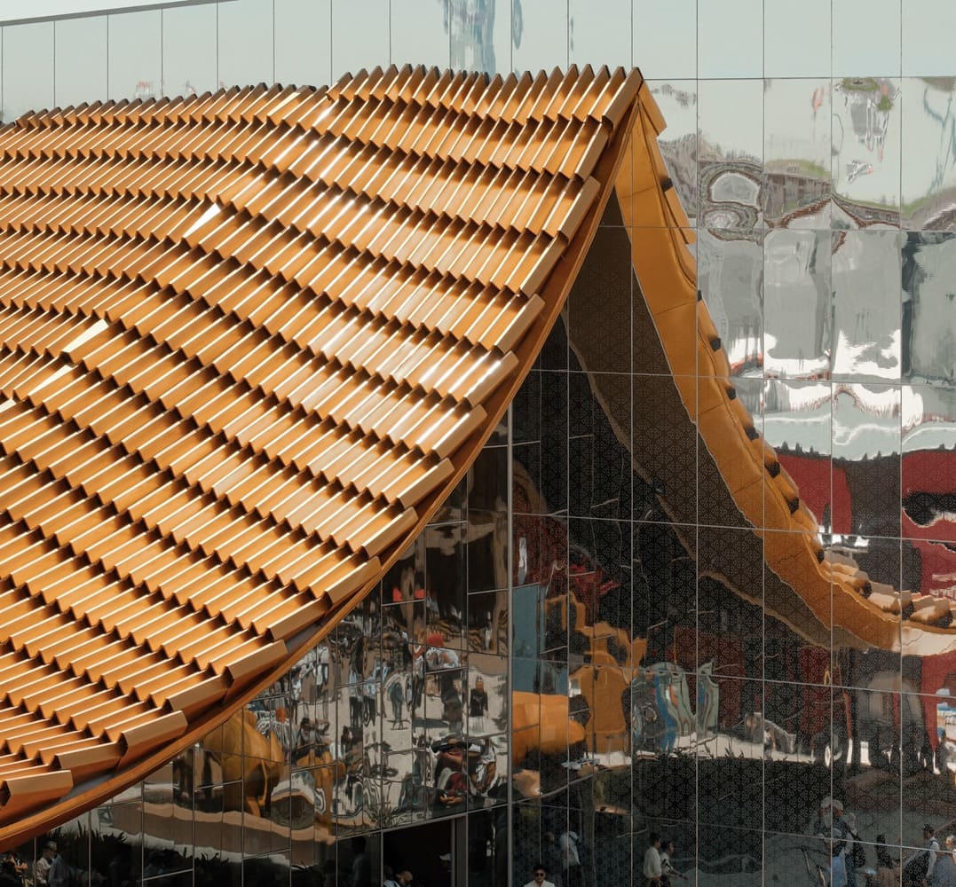 Situated in the Connecting Lives zone of the Expo Master Plan on Plot Site A13, the pavilion occupies a rectangular site with narrow frontage and considerable depth. To address this geometry, A49 designed a half-gable roof flanking a high reflective wall, which creates the visual illusion of a complete gabled structure when viewed from the main approach. This reflective surface not only enhances the pavilion’s perceived scale but also guides visitors naturally into the exhibition spaces.