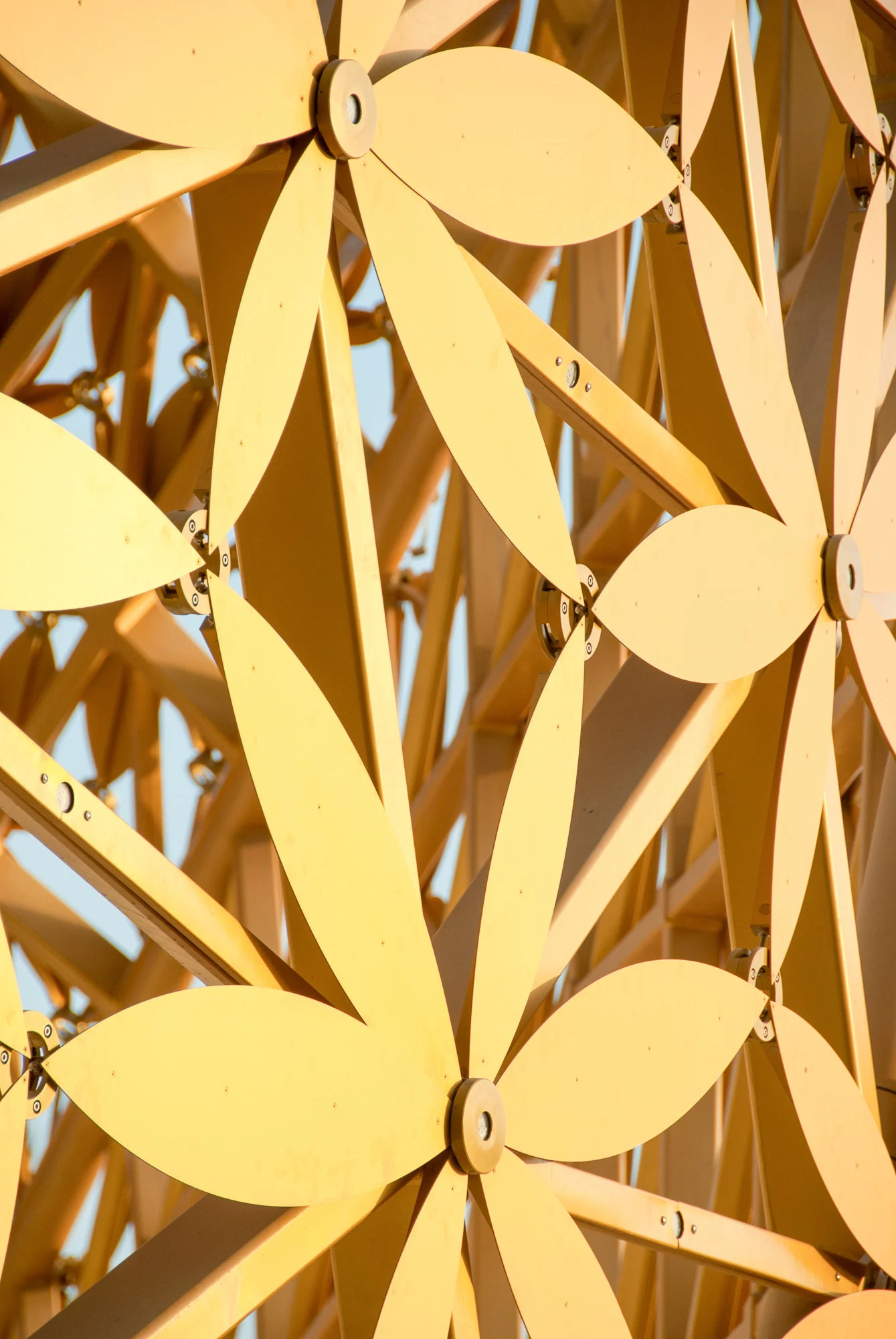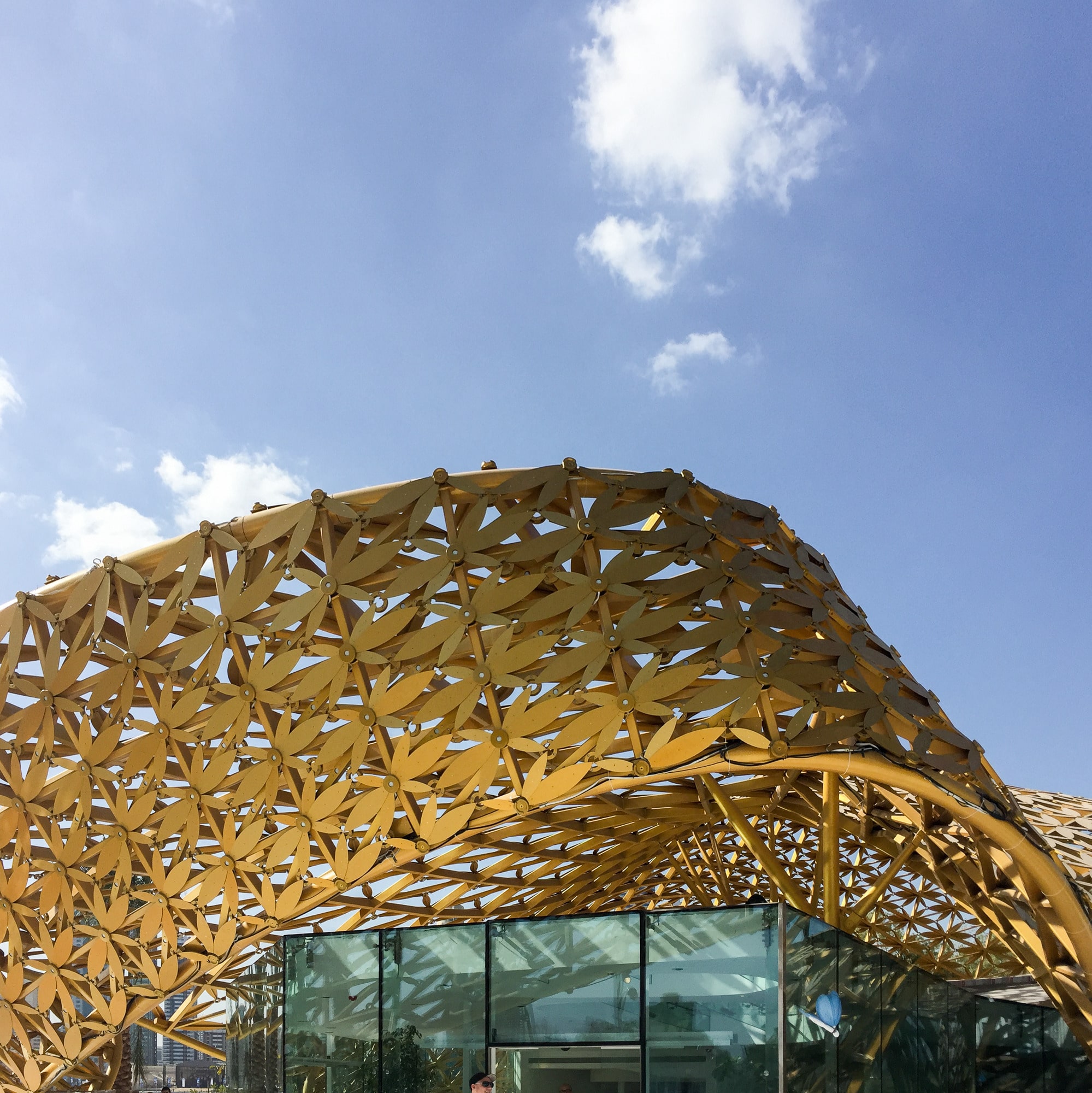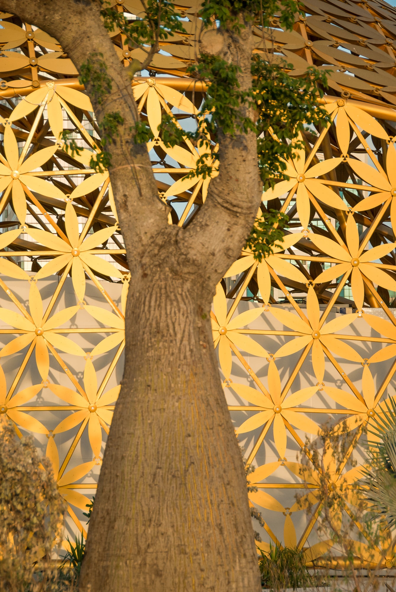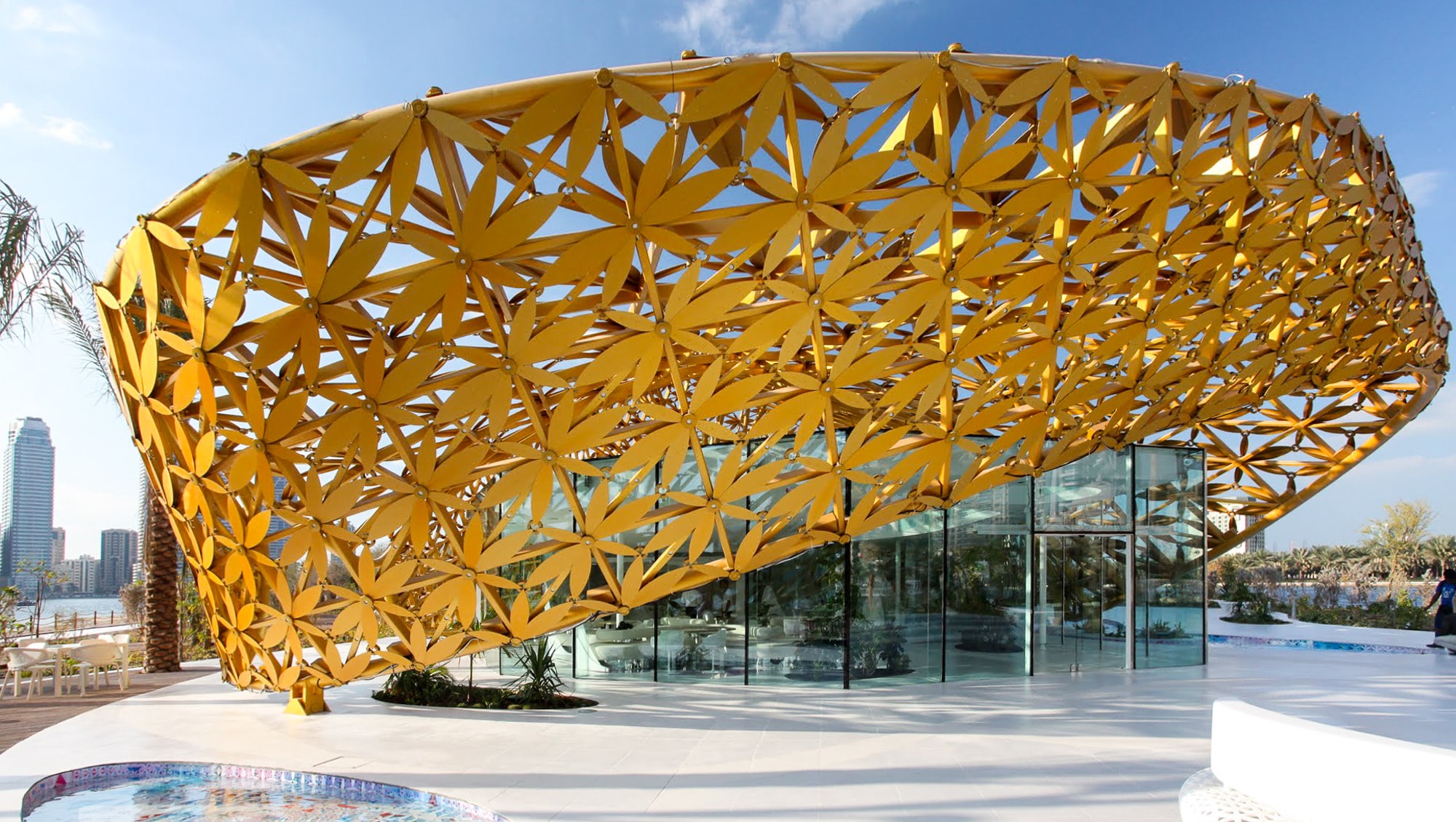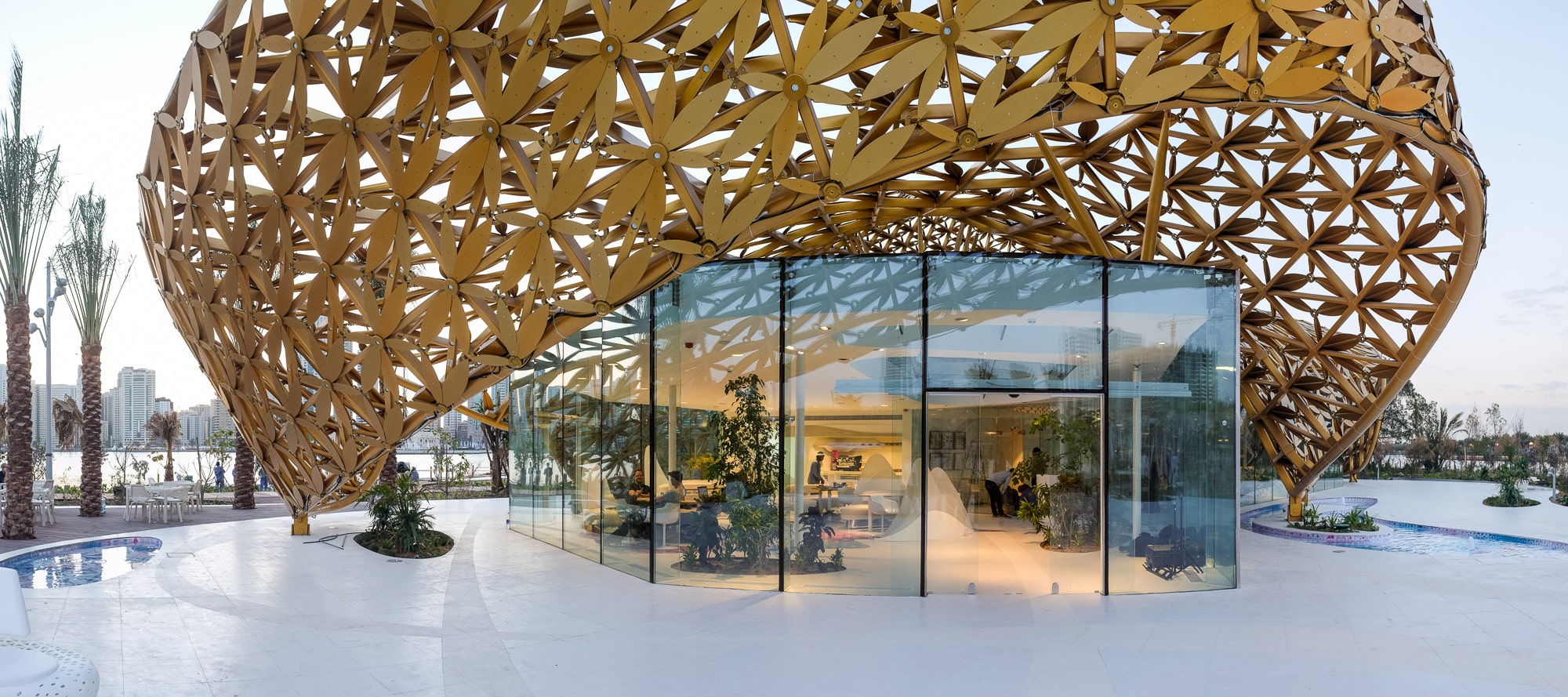 The design blends modern parametric strategies with motifs inspired by traditional Arabian ornamentation. This dialogue between past and present results in a highly complex roof geometry composed of a lightweight 3D frame adorned with over 4,000 golden aluminum elements. The shimmering roof becomes a sculptural feature that reflects both cultural heritage and contemporary architectural innovation.