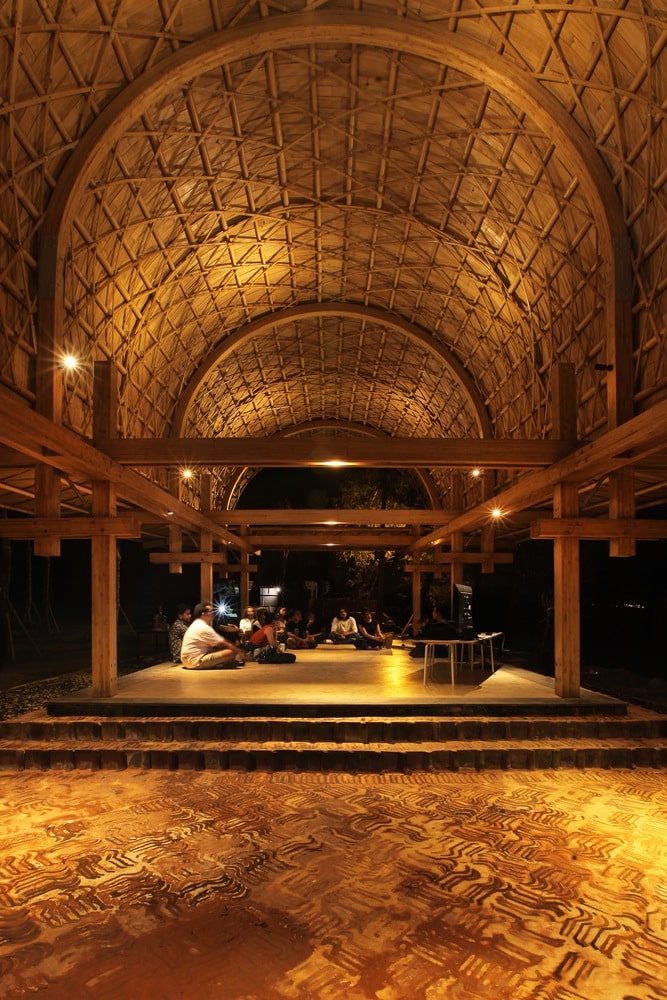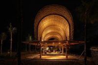 The BaleBio Pavilion at Mertasari Beach in Sanur, Bali, reimagines the iconic Bale Banjar—the open-sided community halls that anchor every Balinese village. Traditionally used for ceremonies, music, and public gatherings, the Bale Banjar is a symbol of social cohesion and cultural continuity. Cave Urban translated this familiar form into a lightweight, elevated pavilion, blending bamboo and recycled materials with regenerative design principles. The pavilion retains the openness and communal spirit of its traditional precedent while demonstrating innovative approaches to sustainable architecture.