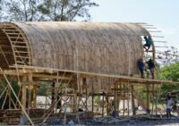 Part of Bauhaus Earth’s ReBuilt Project, BaleBio embodies the investigation into “transformation pathways towards a regenerative built environment,” a global initiative spanning Berlin, Bhutan, South Africa, and Bali. The pavilion merges local craftsmanship with urban construction techniques, exploring bio-based materials and low-impact building strategies. Its form consists of three curved laminated-bamboo vaults spanning four meters each, rising 8.5 meters above a podium constructed from recycled temple stone. The arched roof also draws inspiration from the Lumbung (rice-barn) and Balinese coastal boat-building traditions, creating a fluid structure that bridges inland and maritime vernaculars.