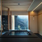 From here, the light continues deeper into the home, guiding guests toward the bathing area. Sliding open a large shoji screen reveals a stone-tiled bath space—spacious, tranquil, and oriented toward the courtyard. Here, nature re-enters the architectural composition. A nearby window frames the tsuboniwa, where the delicate leaves of a maple tree respond to the passing seasons, allowing guests to witness subtle changes in color, shadow, and movement.