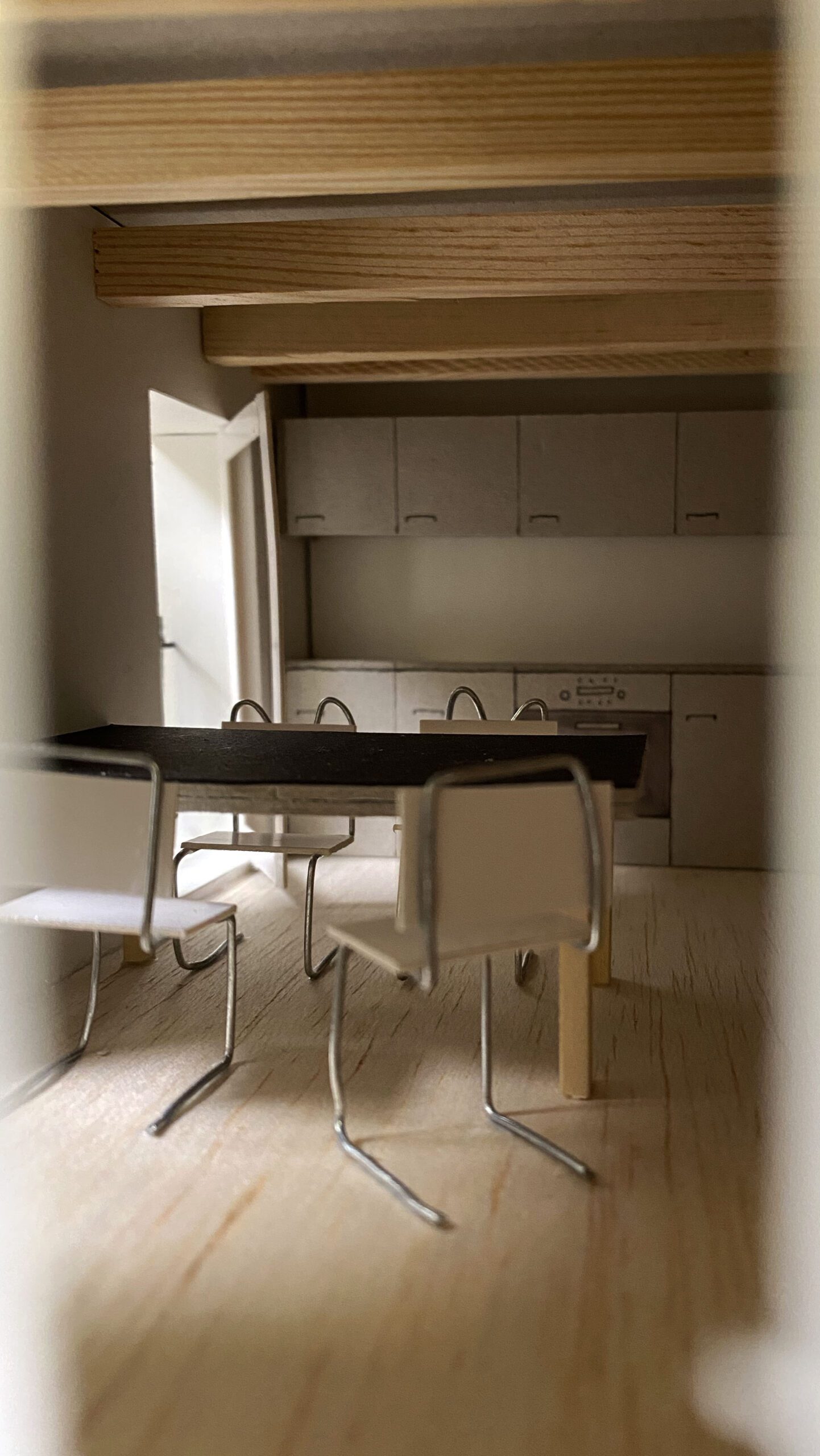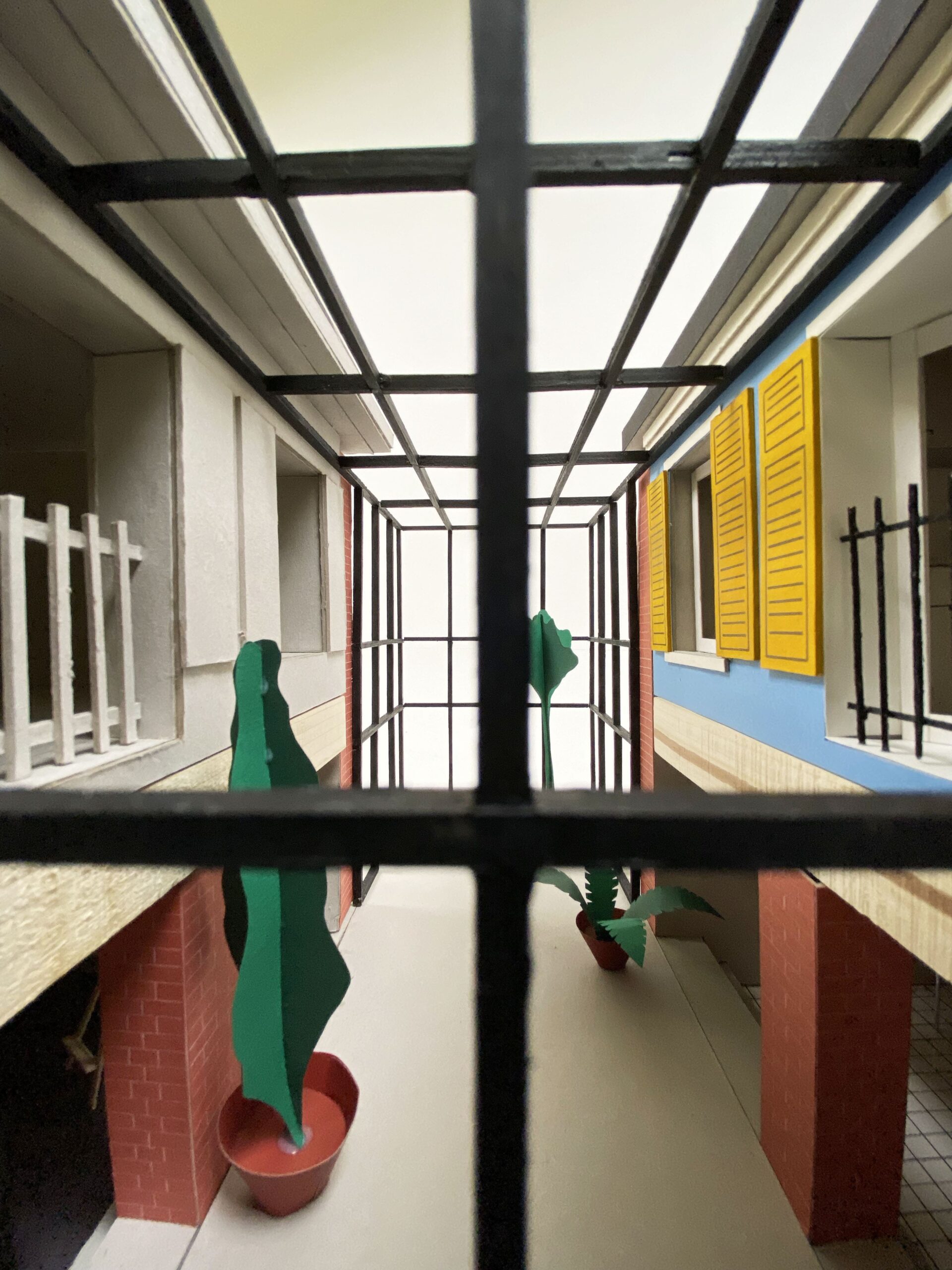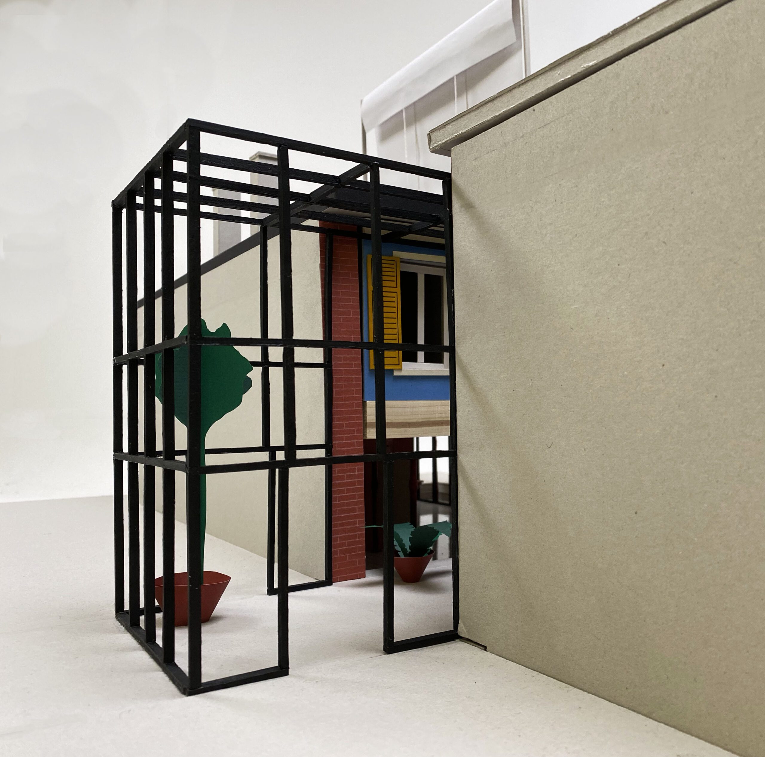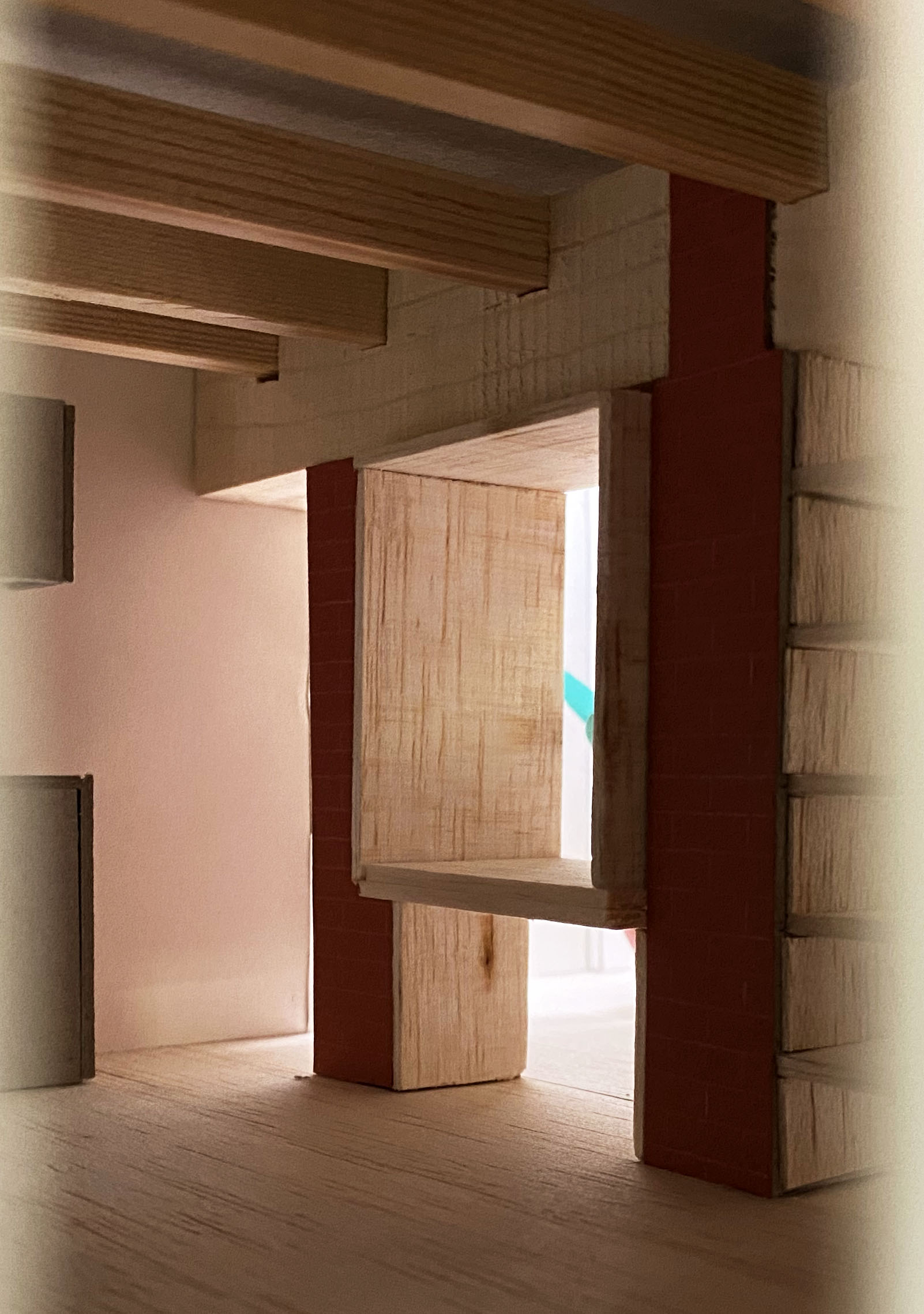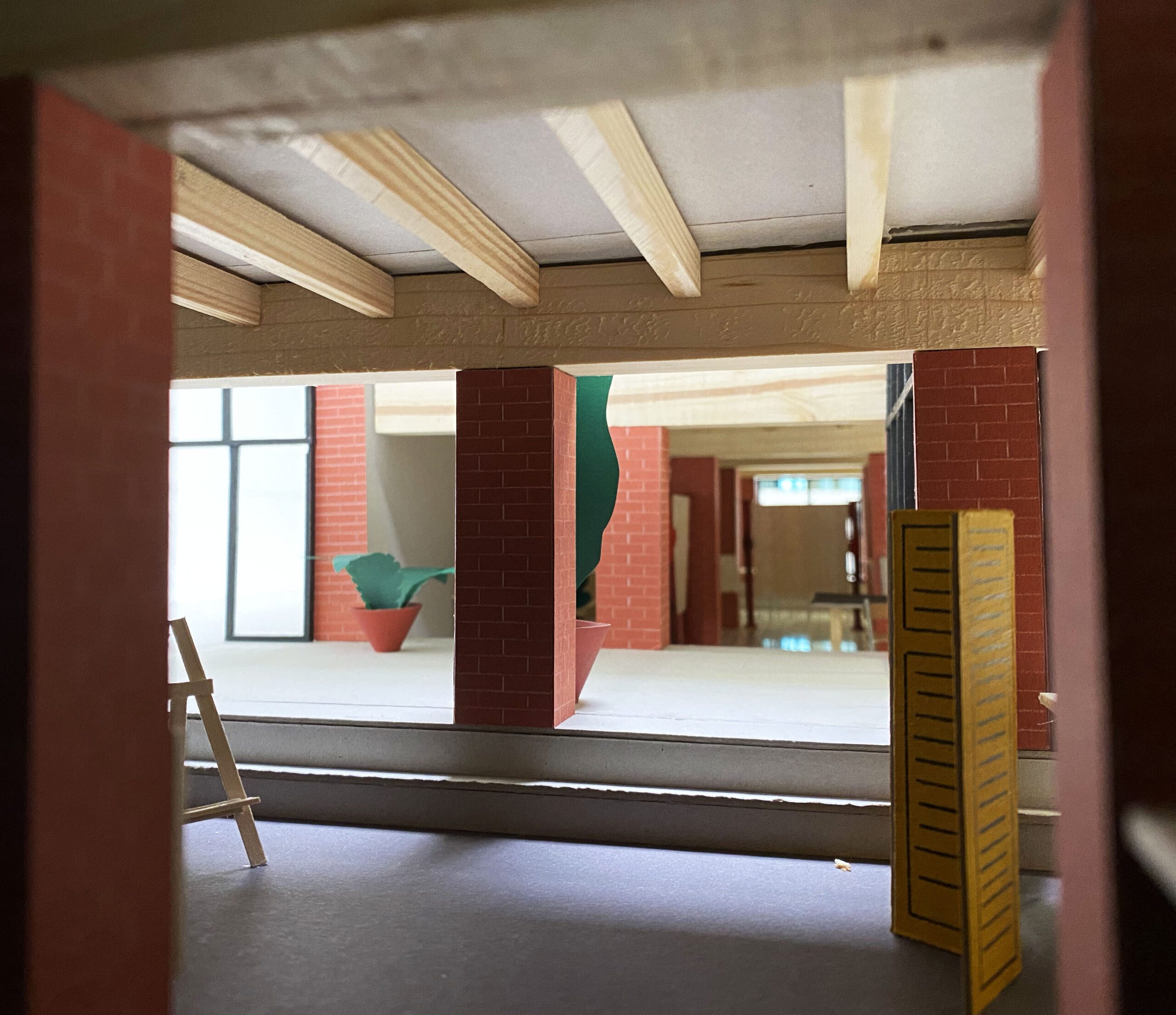 This intervention was done in the middle window of the side wall, at height of the kitchen. This will allow more light to shine into the house, as well as allow communication between inhabitants and users of the community space, pushing their interaction. We then took the grille of the windows below and placed it as a railing. On the most intime domain, we tried to give the living room another quality. We broke down the wall separating it from the corridor, replacing it by a bookshelf and a wooden niche. The niche can be used as a reading nook, a small working table or as an enlargement of the dinner table. By this, the corridor obtains more light and becomes part of the living room. By the living room being expanded, it becomes a central space of the house. All in all, we tried to find a balance between big interventions and smaller ones, always having in mind to better the living conditions of the inhabitants blue house and enhance the community feeling.