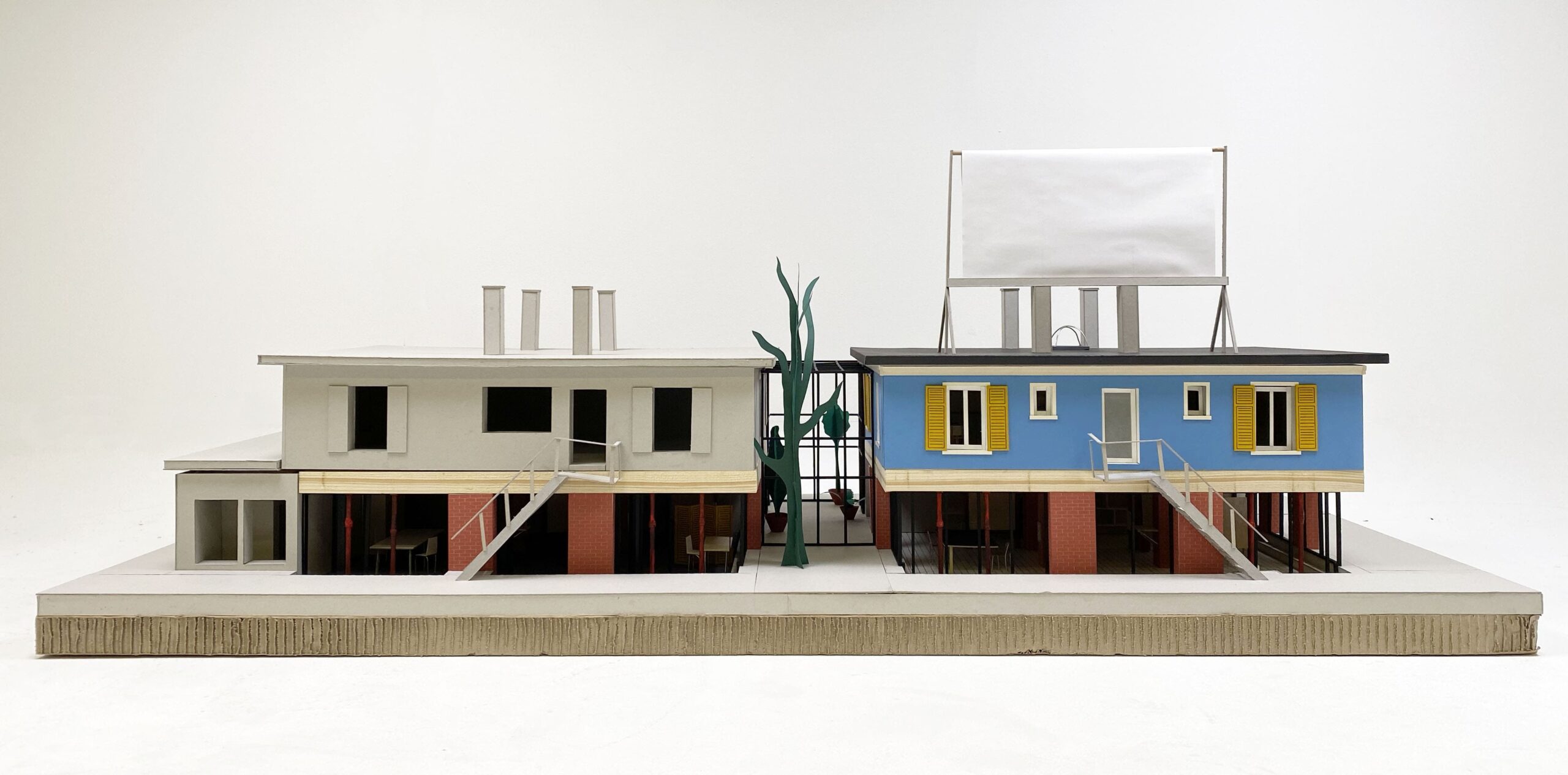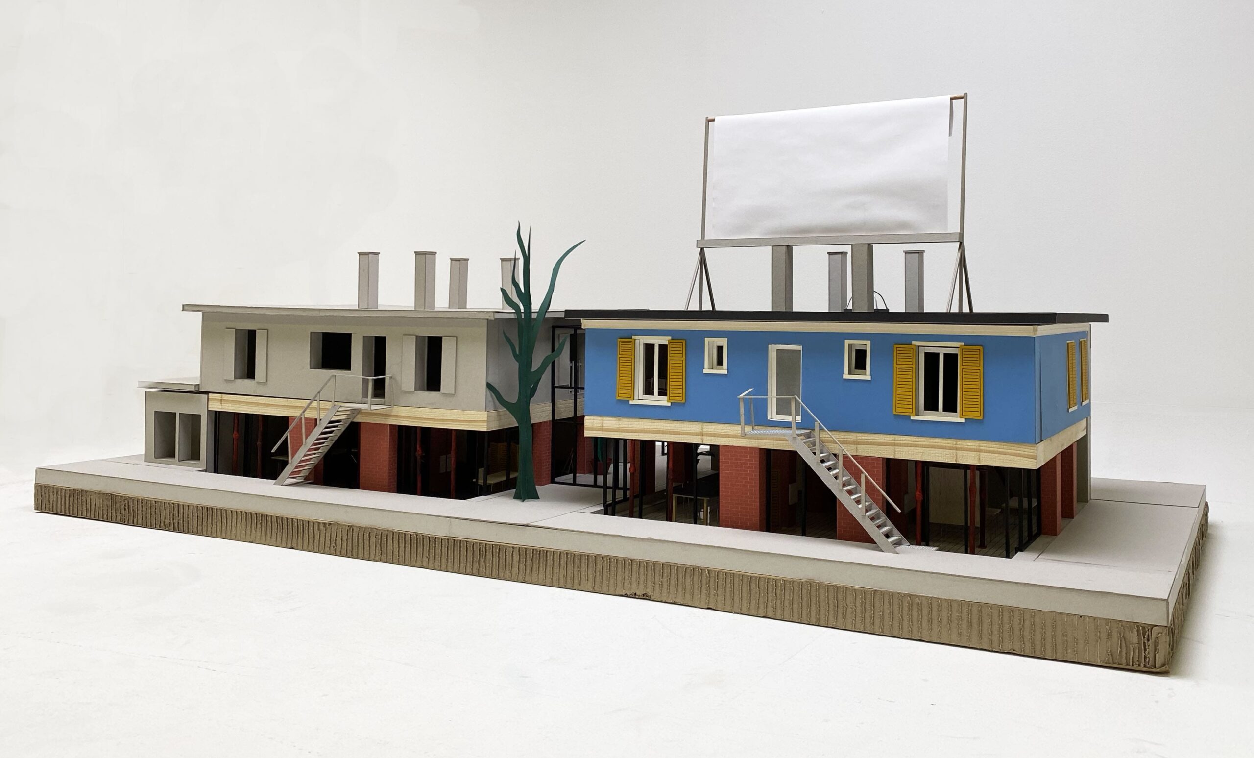 For example converting a shower into a vocal chamber, the doka poles and a wood plank making up the partition walls or using the scaffold from the building site as a bookshelf. For our re-uses, we operated on different scales, enhancing and pushing certain qualities we thought to be important and also giving a new relationship between the blue house and its context. Picking up one of the themes of the first movement of being observed by all the neighbors, we decided to profit from this situation and install a screen on top of the blue house. A movie can be screened from the two facing buildings at the same time.