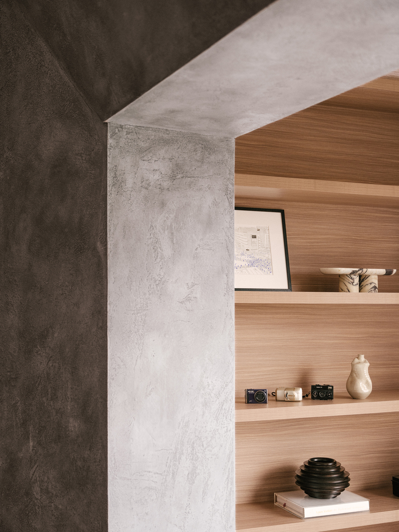 A hallmark of VC Residence lies in the statement plaster portal frames that adorn the various spaces, lending an air of architectural sophistication. These frames not only serve as structural elements but also create a sense of depth and visual interest, captivating the eye and inviting exploration within the space. The portals lead from one space to another, while walls were removed to create a looping path throughout the apartment.