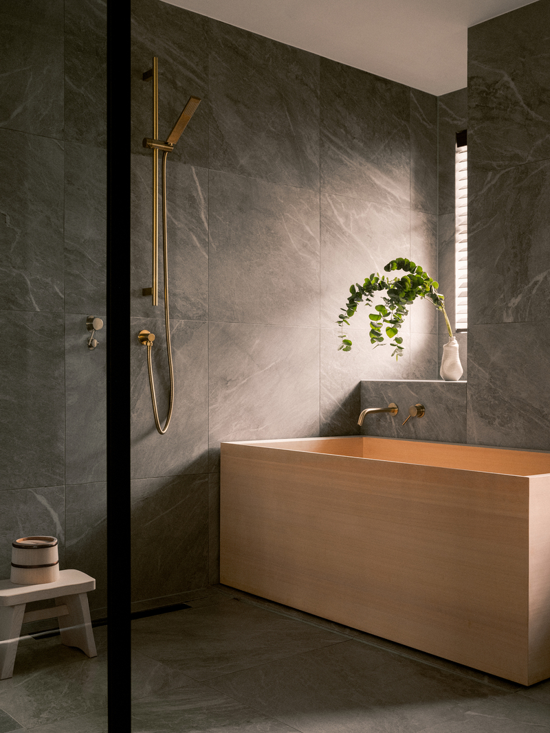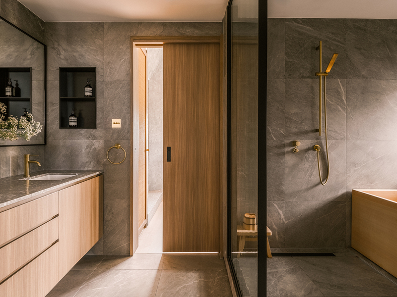 Inspired by the client’s affinity for Japanese design, subtle touches of Japanese aesthetics are thoughtfully incorporated throughout the apartment. Large Japanese-style sliding doors, characterized by clean lines and understated elegance, delicately separate spaces while keeping the flow of the apartment very fluid and infuse a touch of traditional charm. Additionally, the client’s personal touch is evident in the carefully sourced bathtub imported from Japan, elevating the bathroom experience.