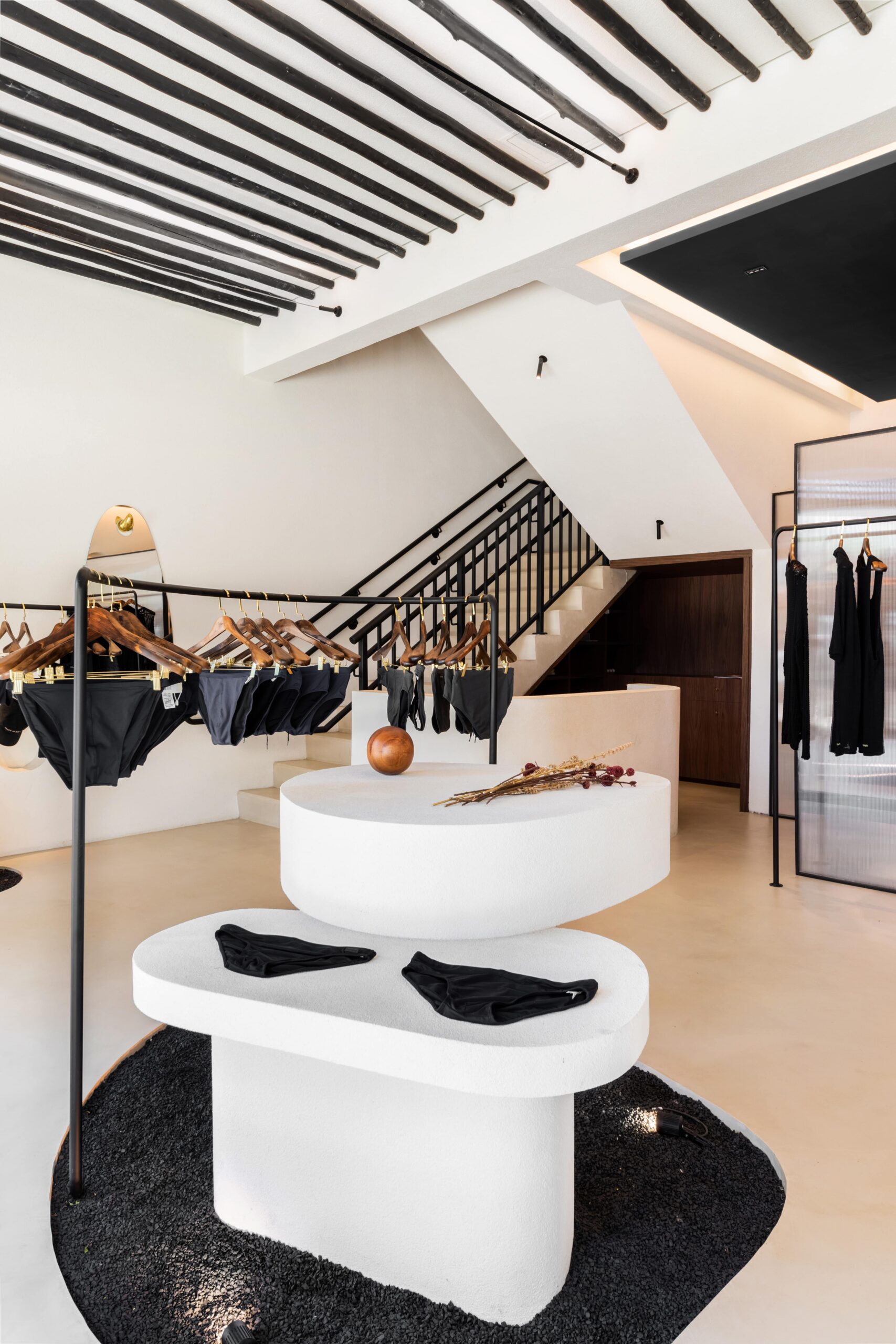 Neutral tones and organic forms shape the architecture, enhancing the display of men’s beachwear pieces