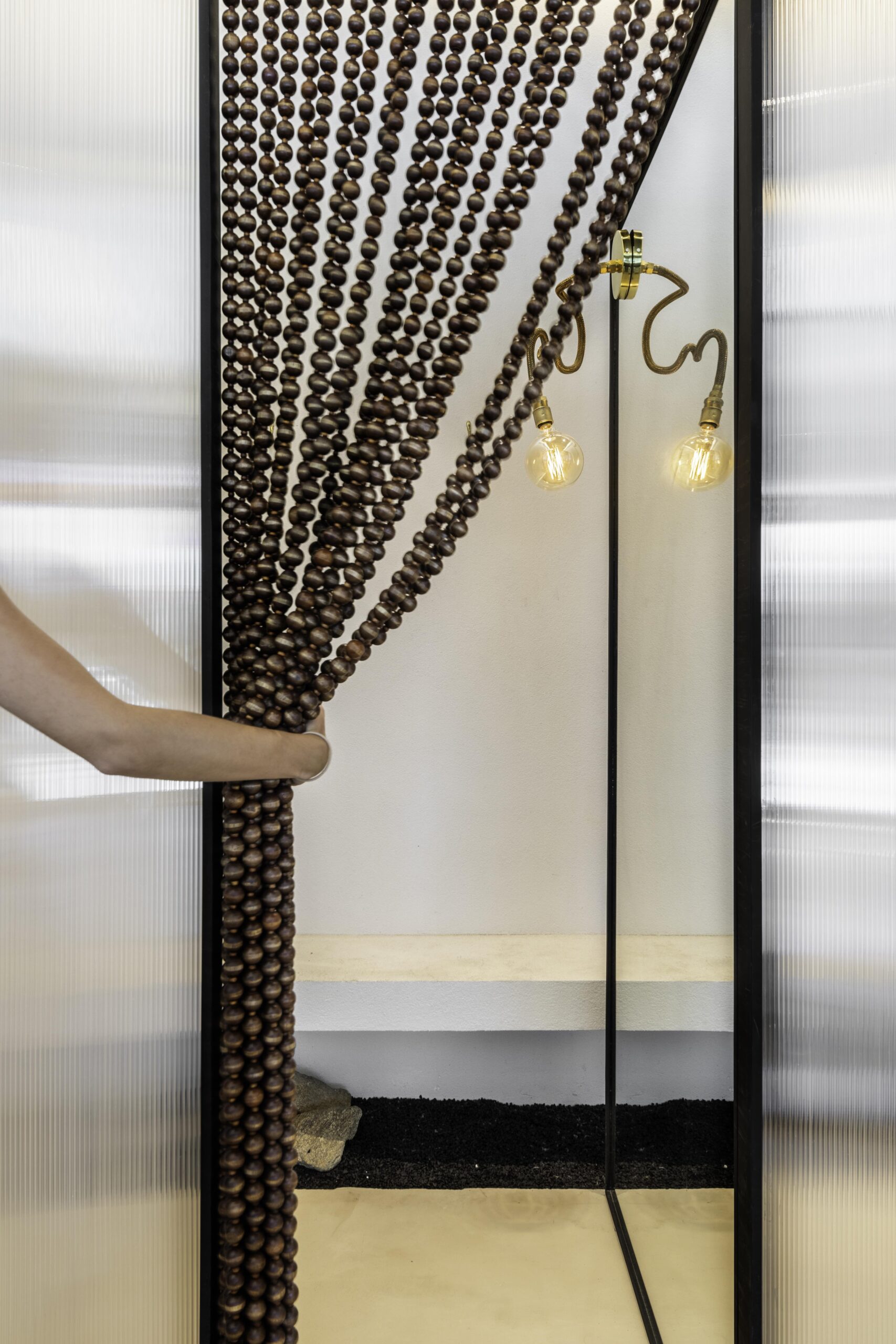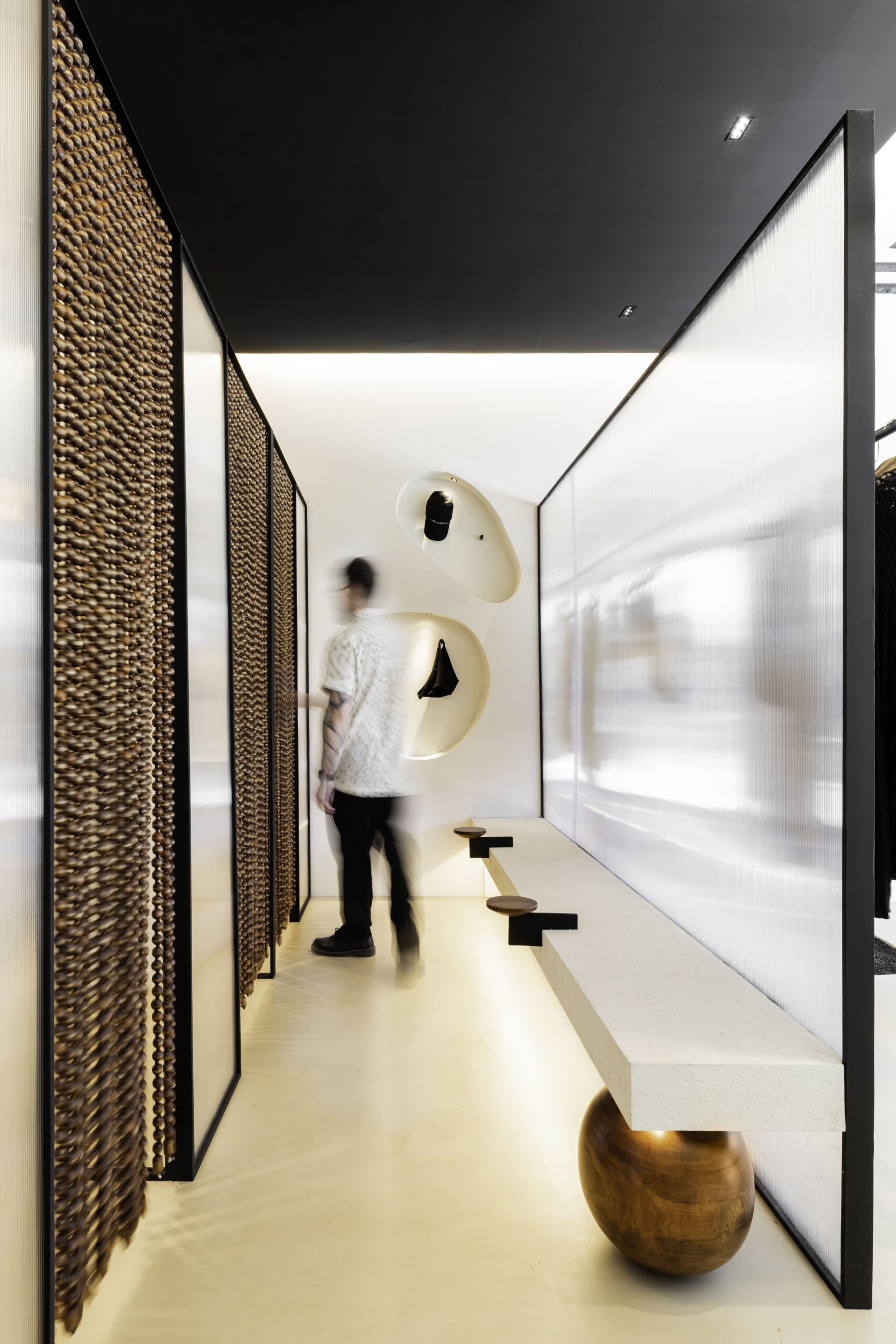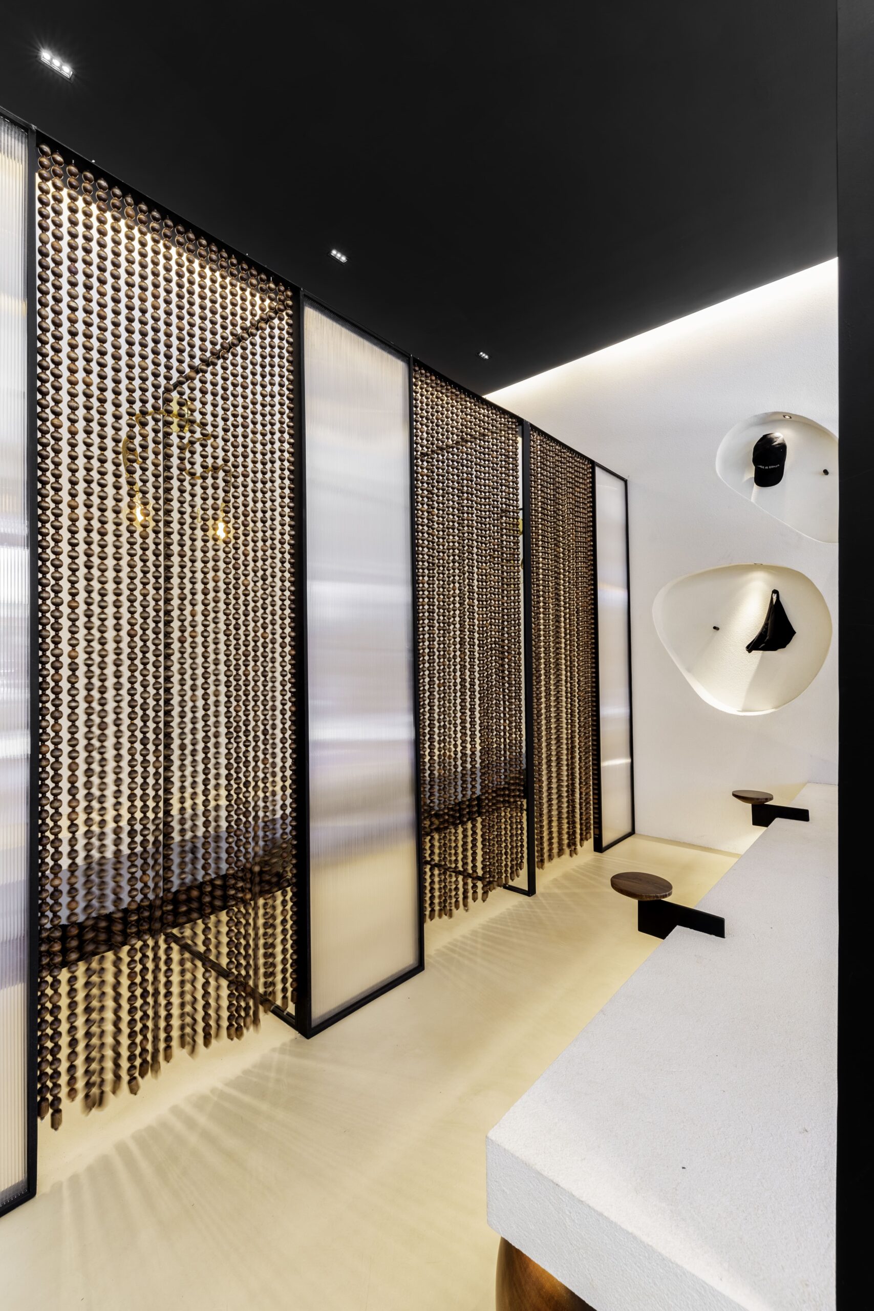 A standout feature is the fitting room zone, where design subtly shifts into a more expressive tone. The dressing areas are connected by a shared bench and enclosed with beaded curtains, introducing layers of transparency and movement. This playful detail softens the space and adds a sense of spontaneity and personality.