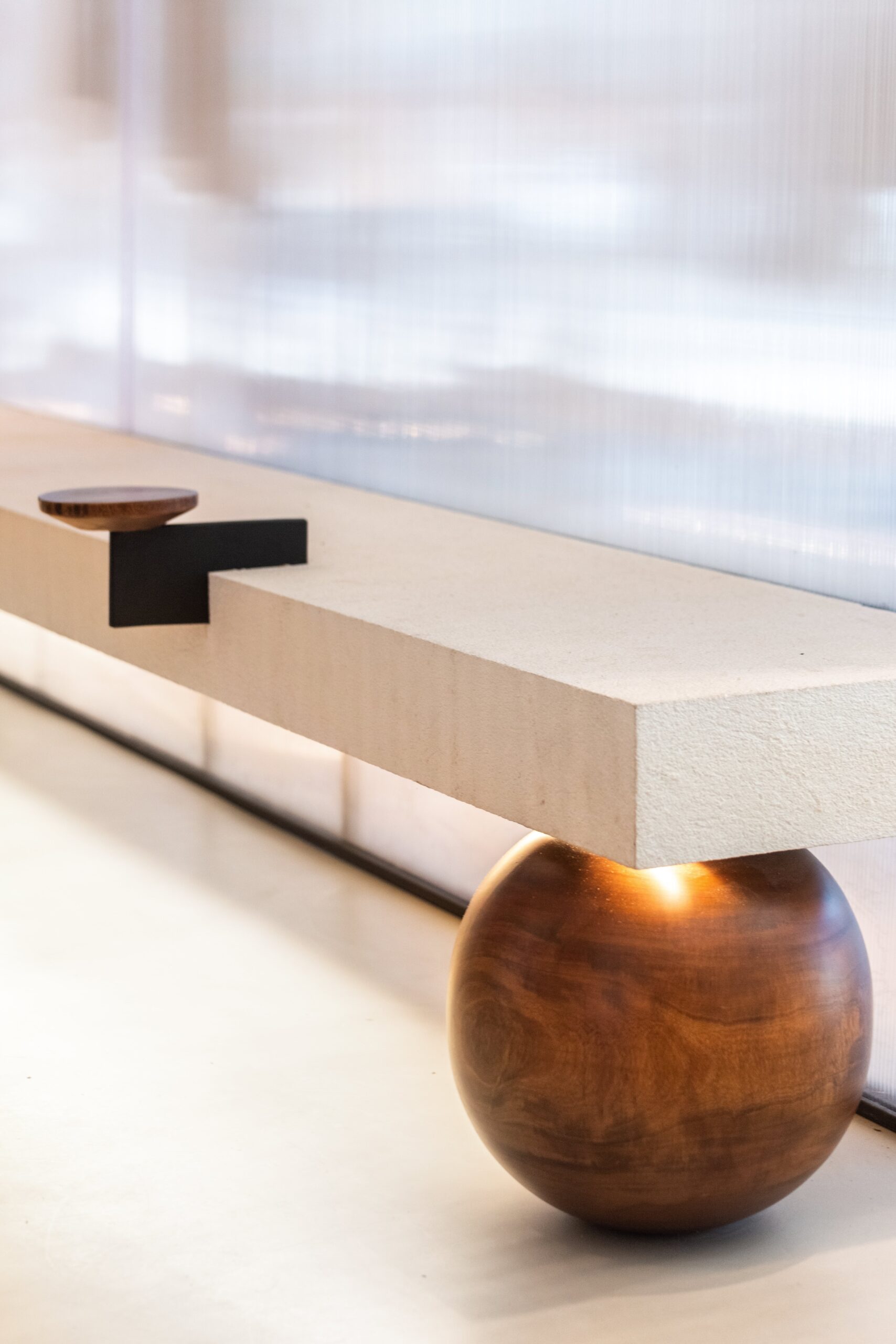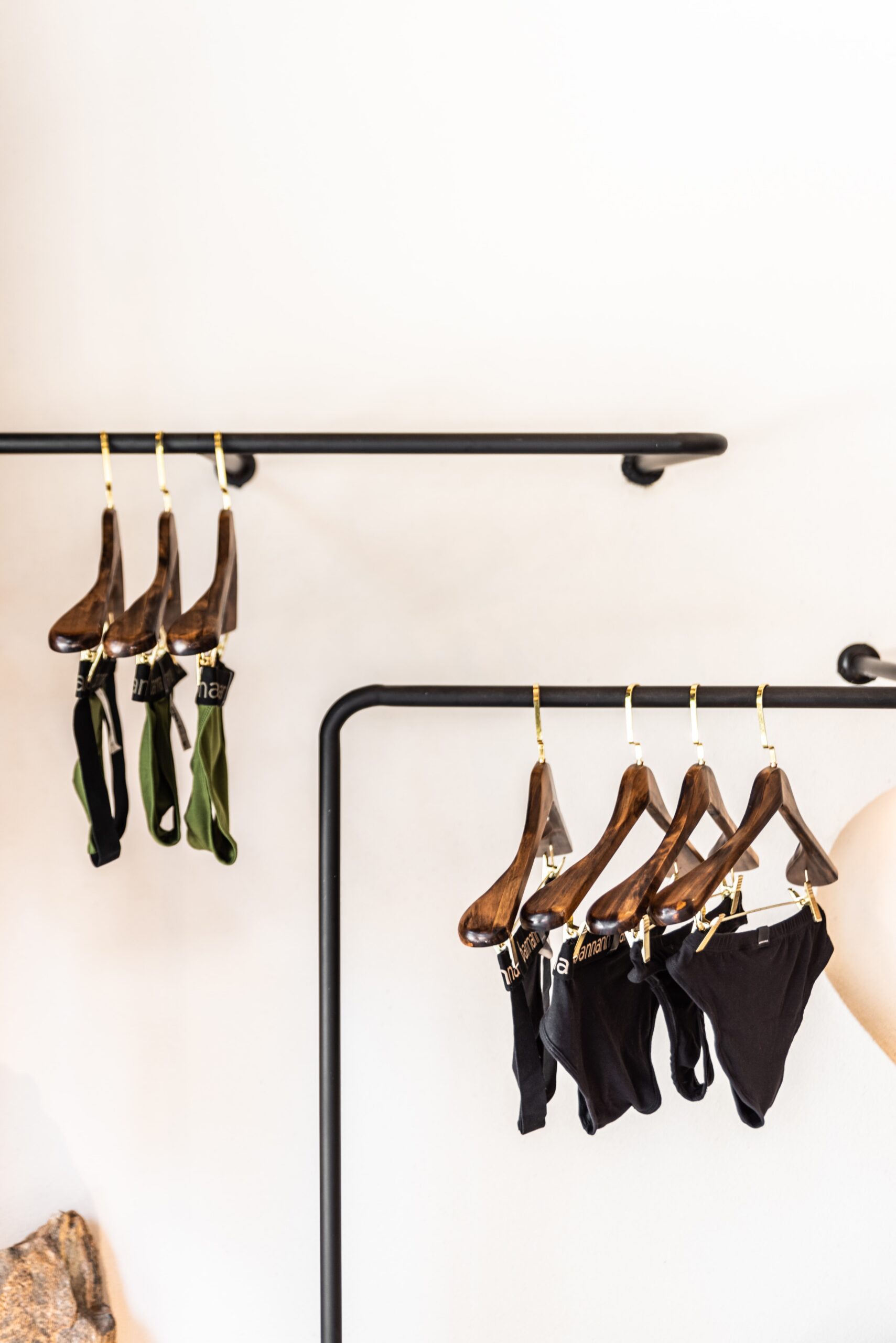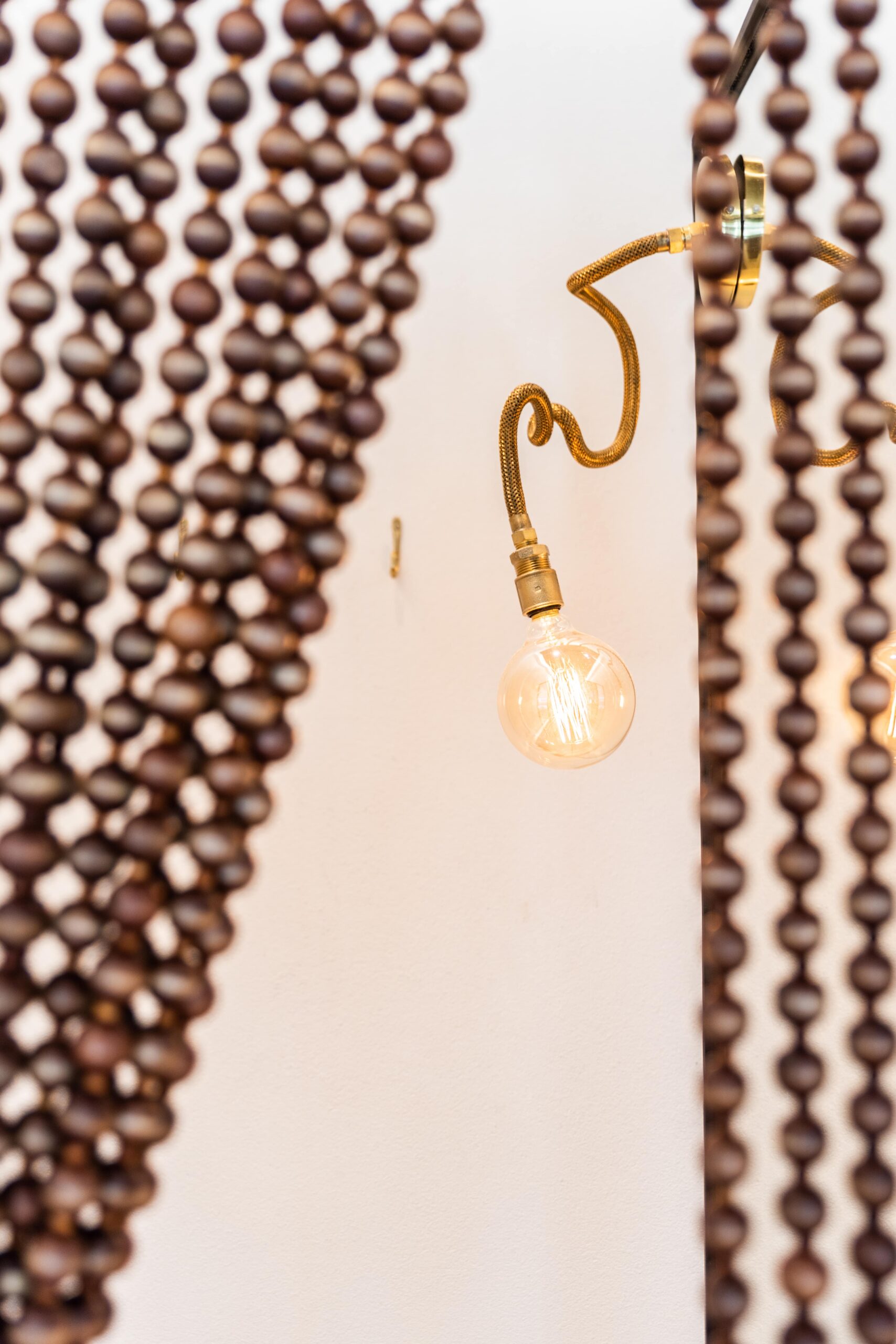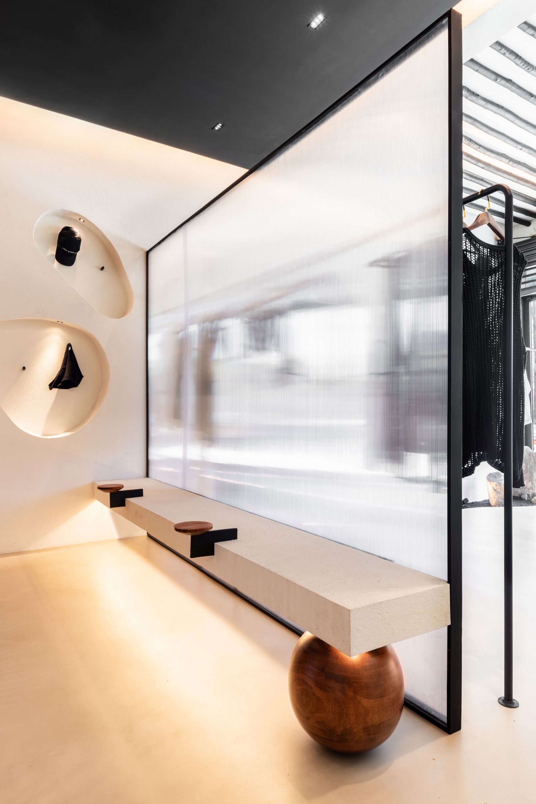 A standout feature is the fitting room zone, where design subtly shifts into a more expressive tone. The dressing areas are connected by a shared bench and enclosed with beaded curtains, introducing layers of transparency and movement. This playful detail softens the space and adds a sense of spontaneity and personality.