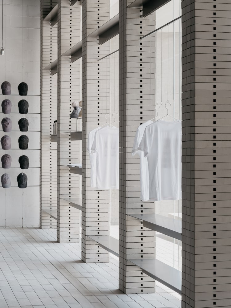 To accommodate the brand’s growing and diverse product lines, the exhibition hall integrates a rear second floor for warehouse storage and office functions. Two staircases flanking the space, along with a second-floor walkway, create a circular circulation route that facilitates both staff operations and visitor engagement. The first floor serves as the main display area, where front and side walls are utilized as primary display interfaces. Functional pillars within the space serve as structural anchors and as bases for shelving, enabling flexible presentation of products in response to changing display needs.