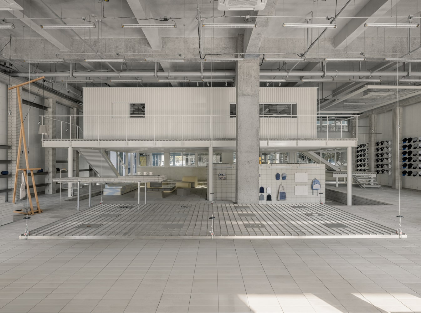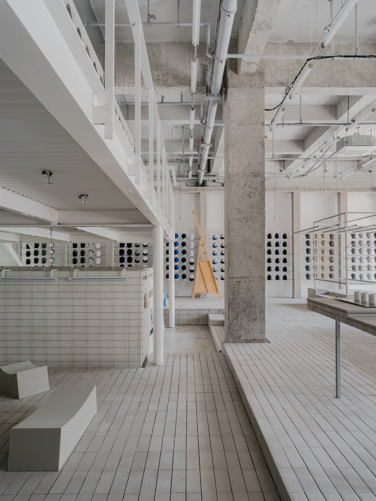 The water bar doubles as both a refreshment station and a display area for cups, while stepped ceramic brick walkways provide comfort and accessibility throughout the multi-level space. Metal mesh racks, adjustable shelving, and integrated display areas allow products of varying sizes to be showcased dynamically, reflecting the factory’s adaptable production philosophy. Tall floor lamps extend the visual scale of the space while also serving as multifunctional display units for smaller items.