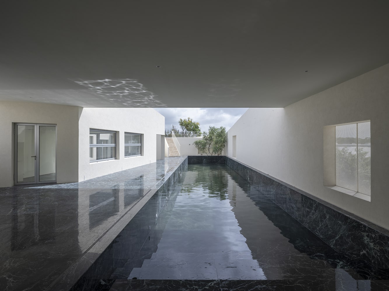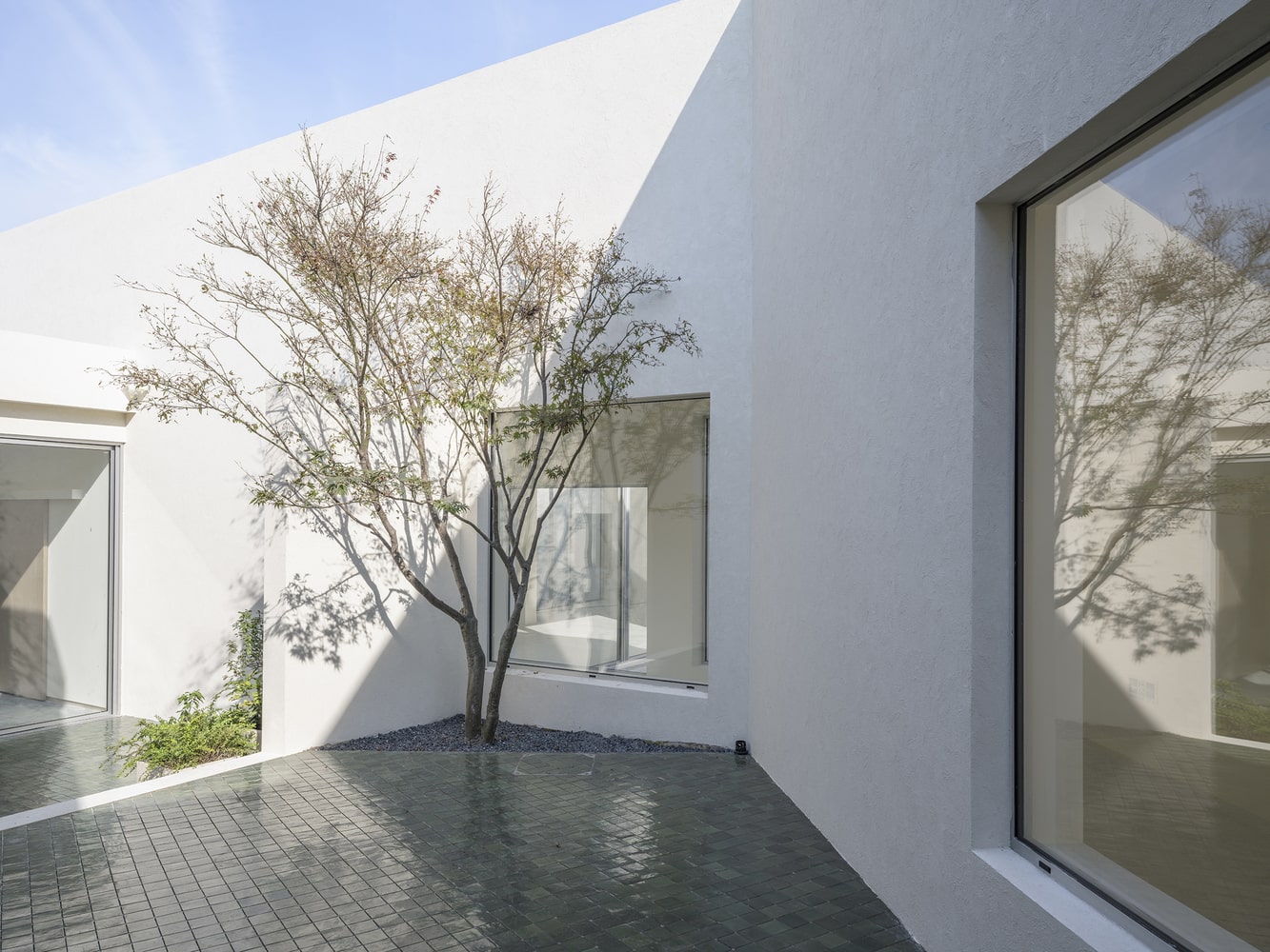 The choreography of the spiral path is enhanced by subtle interventions in the landscape. Earth excavated from the swimming pool was redistributed on-site to form a small hill, enriching the interplay between architecture and terrain. As visitors traverse the undulating path, a delicate, continuous “rockery” emerges, offering an embodied spatial experience that encourages movement both up and down, through expanses that are simultaneously intimate and monumental. This physical journey embodies the Qujing Miyuan concept, making spatial exploration a form of contemplative engagement.