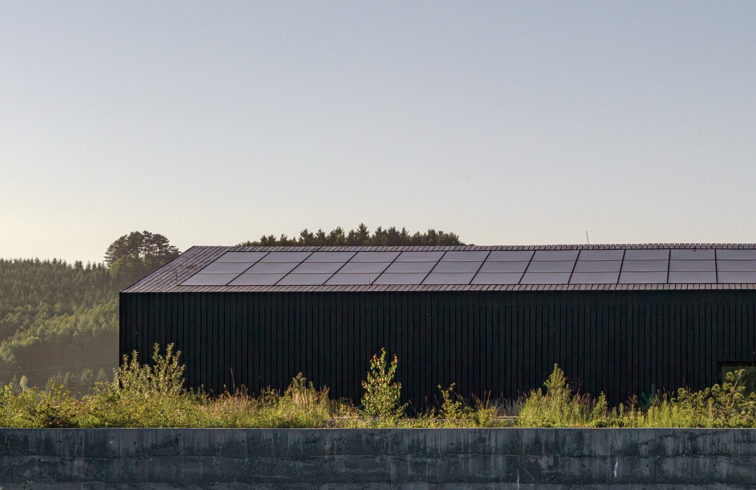 The building’s duality — solid yet transparent, heavy yet light — captures the poetic balance of contrasts. From the road and three of its sides, the structure presents itself as a grounded, monumental object, defined by its black-painted timber façade. From the fourth side, facing the landscape, it dissolves into the terrain, transforming into a slender horizontal line that frames the horizon.