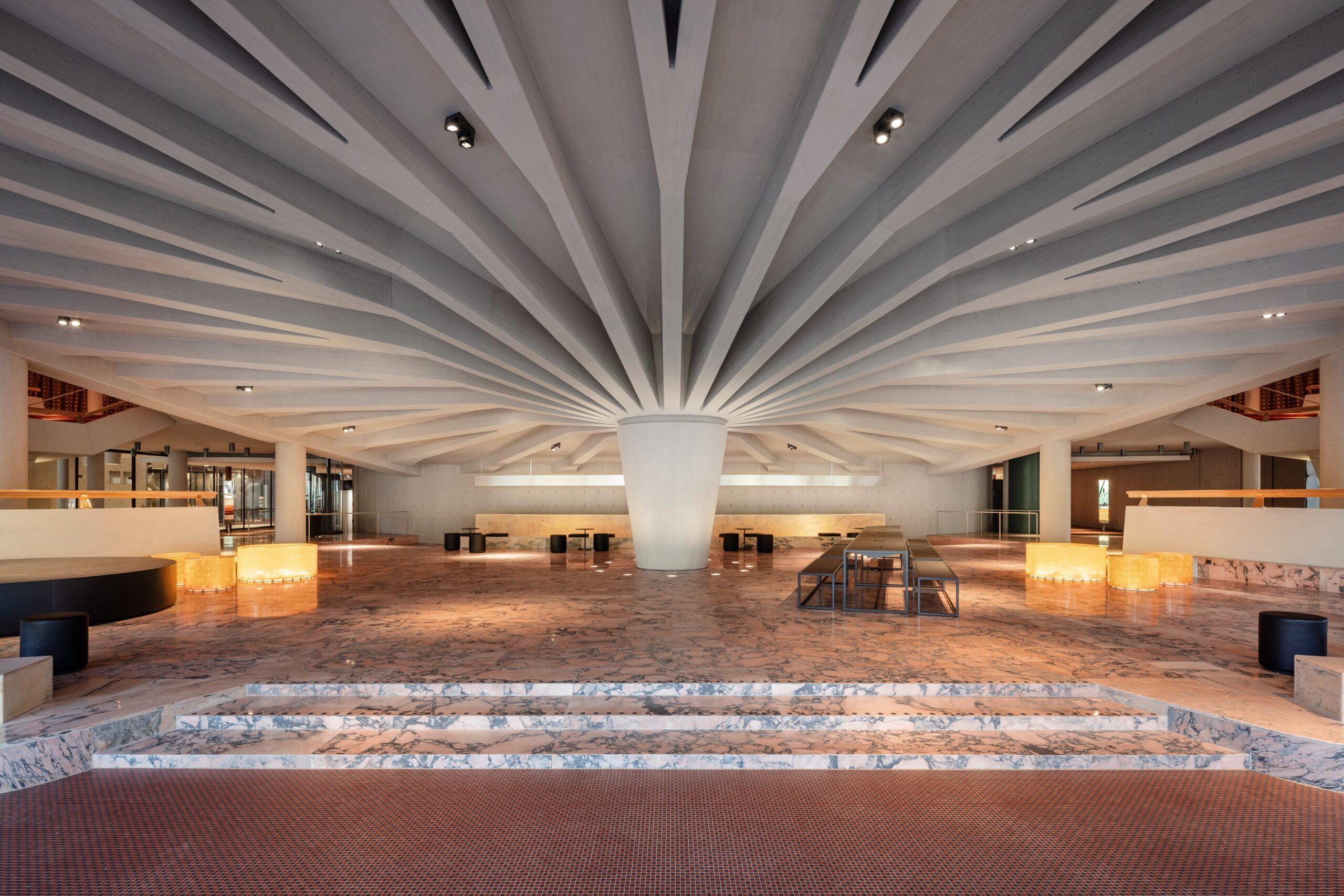 Inside, the refurbishment extends to all public areas, excluding the two theater halls; the great hall underwent renovation in 2010/11. Part of this interior work involves restoring the fair-faced concrete walls that were previously painted or altered. The aim is to maintain the theater’s historical integrity while incorporating necessary technical upgrades.