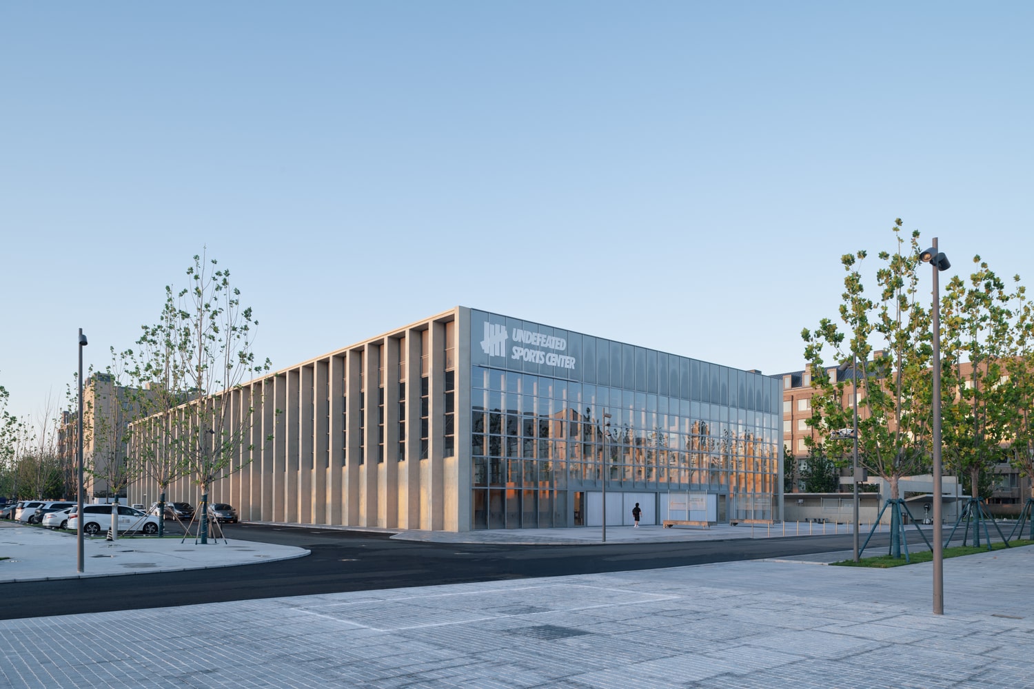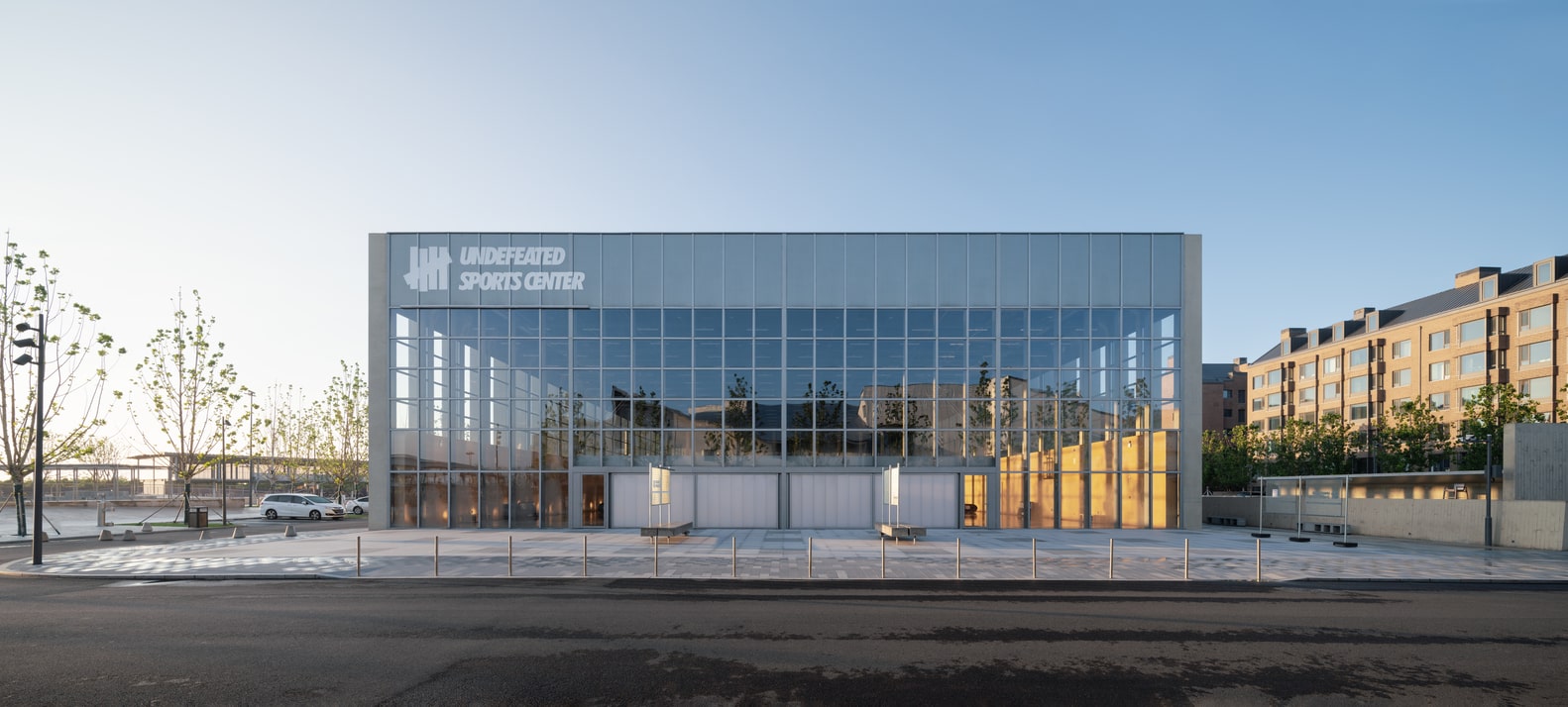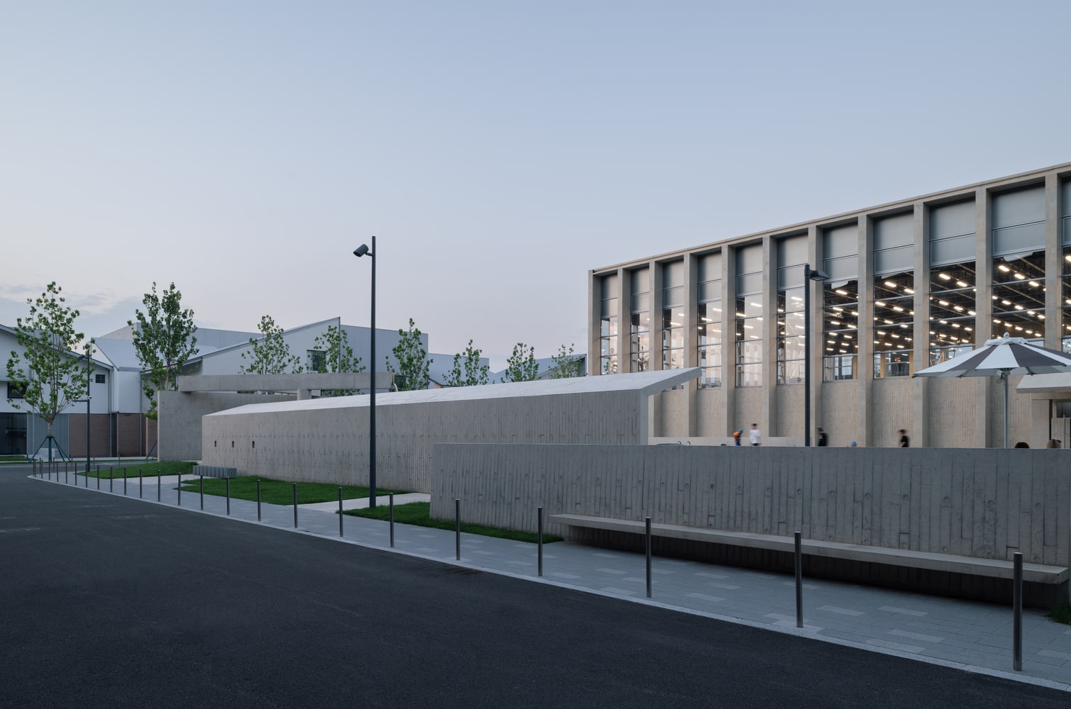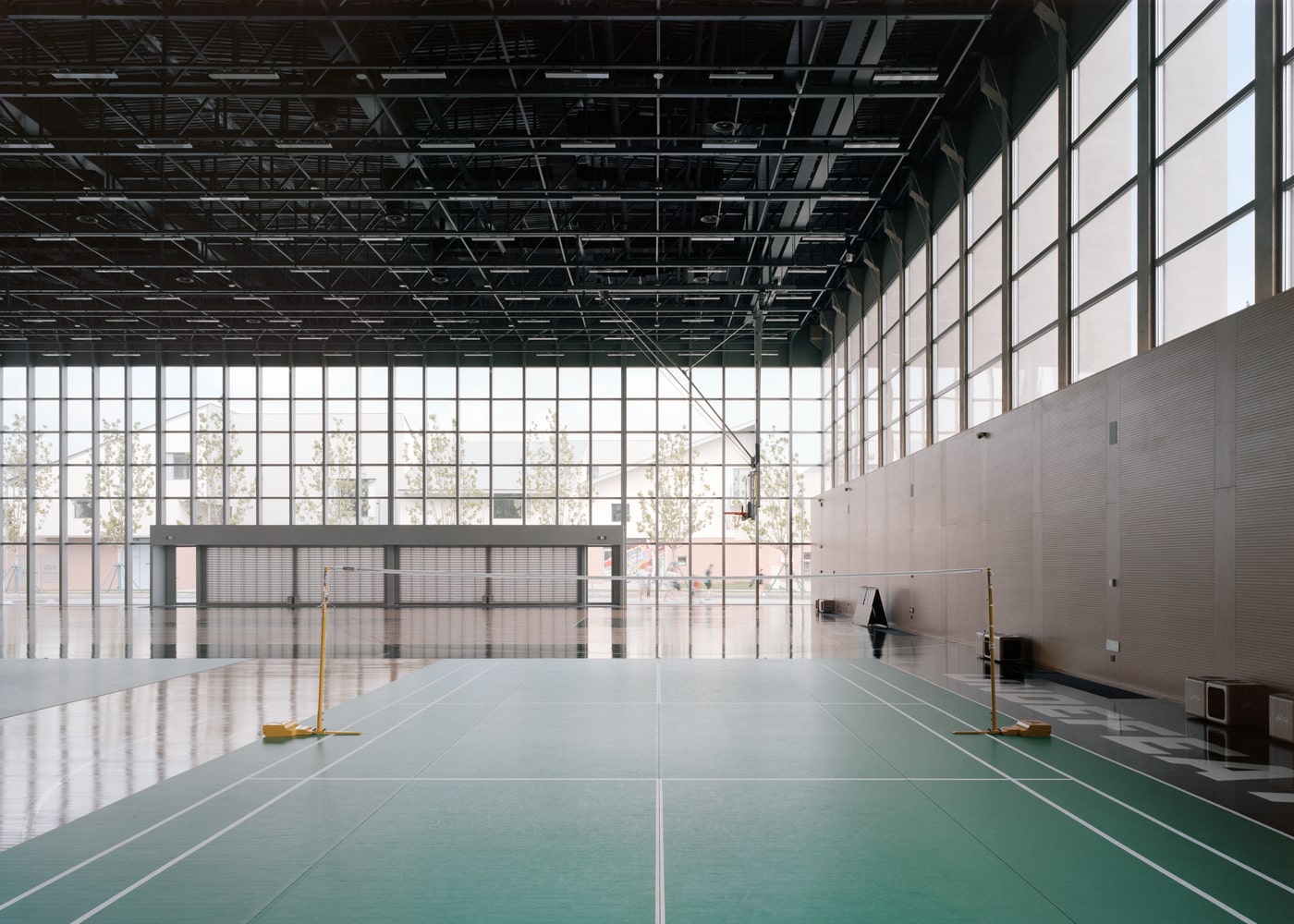 The building’s north façade, facing the community, dissolves the conventional distinction between inside and outside. A fully glazed curtain wall reveals the expansive double-height sports hall, housing two indoor basketball courts. Two massive 18-meter-wide operable doors can slide open entirely, directly connecting the courts with the exterior plaza. This feature transforms the sports hall into a flexible urban stage, capable of accommodating community events, markets, or performances that flow seamlessly between interior and exterior space.