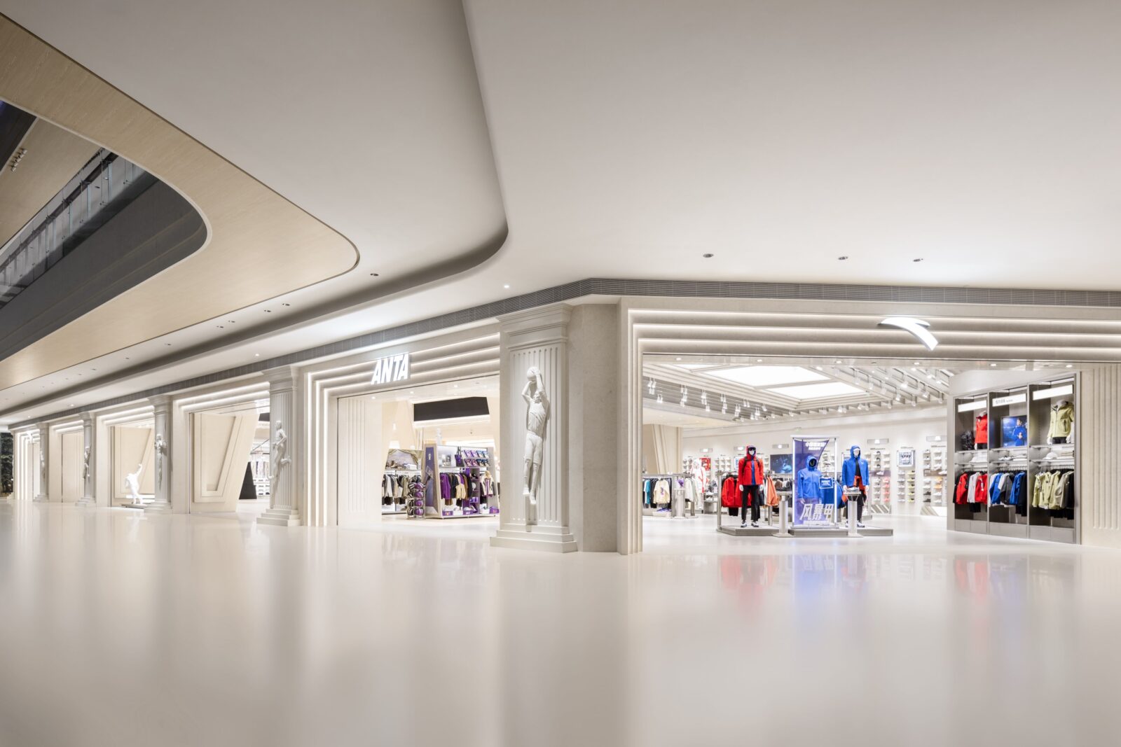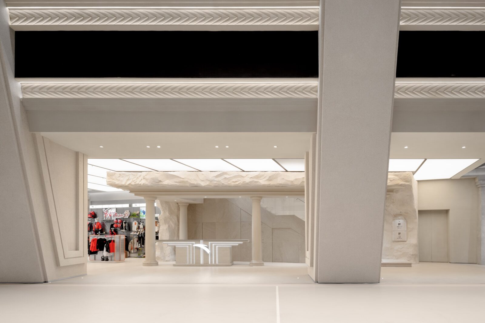 Set between soft-toned marble frames, the emblems of ANTA and its sub-brands—ANTA SNEAKERVERSE and ANTA GUANJUN—are seamlessly integrated into the facade’s structural rhythm. Subtle yet striking, these visual elements echo the strength and beauty inherent to both the brand and the world of athletic competition.