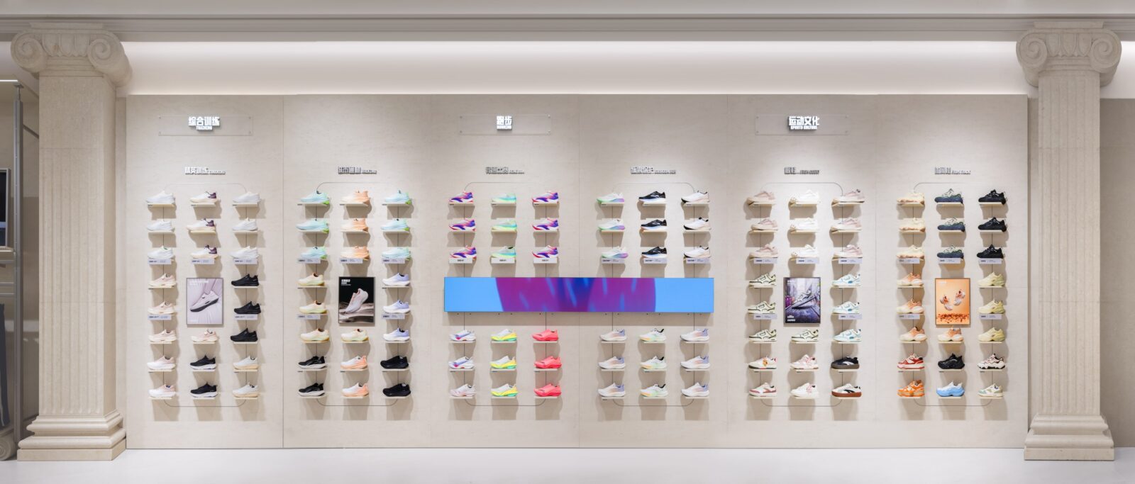 ANTA SNEAKERVERSE is a sub-brand rooted in street fashion culture. Its display area continues the visual identity of its “Black Label” concept stores, enveloped in a dark palette. Its iconic logo breaks through layered classical frames, surging through space with irresistible momentum. It stretches across the ceiling in a gesture of infinite extension, engaging in a dynamic dialogue with the spatial configuration. Overlapping, twisting frames break the rigid rules of traditional symmetry and order. Here, the interplay between the depth of classical civilization and the dynamism of modern fashion creates a powerful visual tension that transcends time and space.