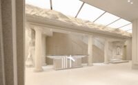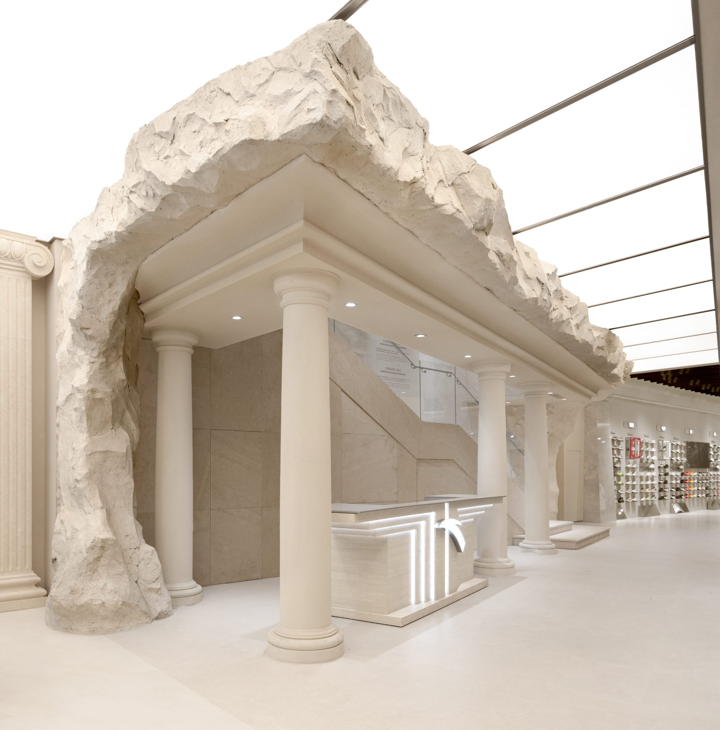 The store facade, anchored by athletic sculptures and Doric columns, evokes a dialogue between the past and present while subtly softening the visual rigidity of repetitive column structures. From a distance, shifting athletic gestures leap into view, transforming the two-level elevation into a vivid canvas that captures the spirit of athleticism. The continuous, sculptural rhythm creates an open and compelling atmosphere, pulsing with the vibrant energy of athletic competition.