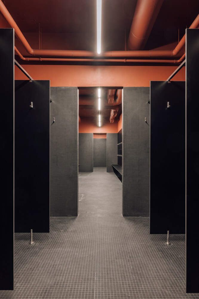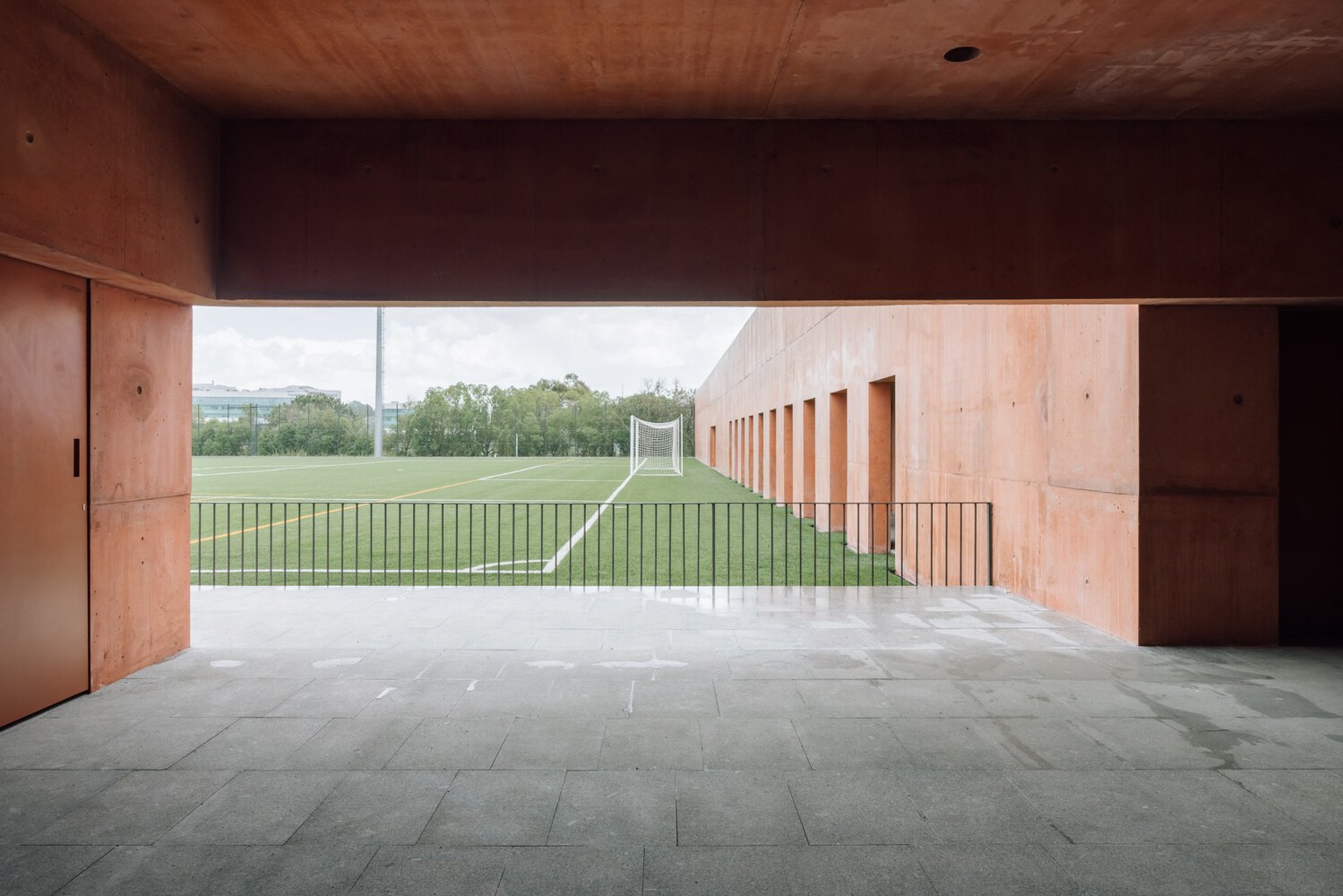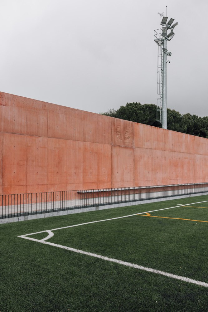 The wall’s arcade of openings provides rhythm and transparency, creating a visual link between the interior facilities and the exterior field. The use of shadow and light enhances the depth of these spaces, turning what could have been a purely utilitarian structure into a place of presence and atmosphere.