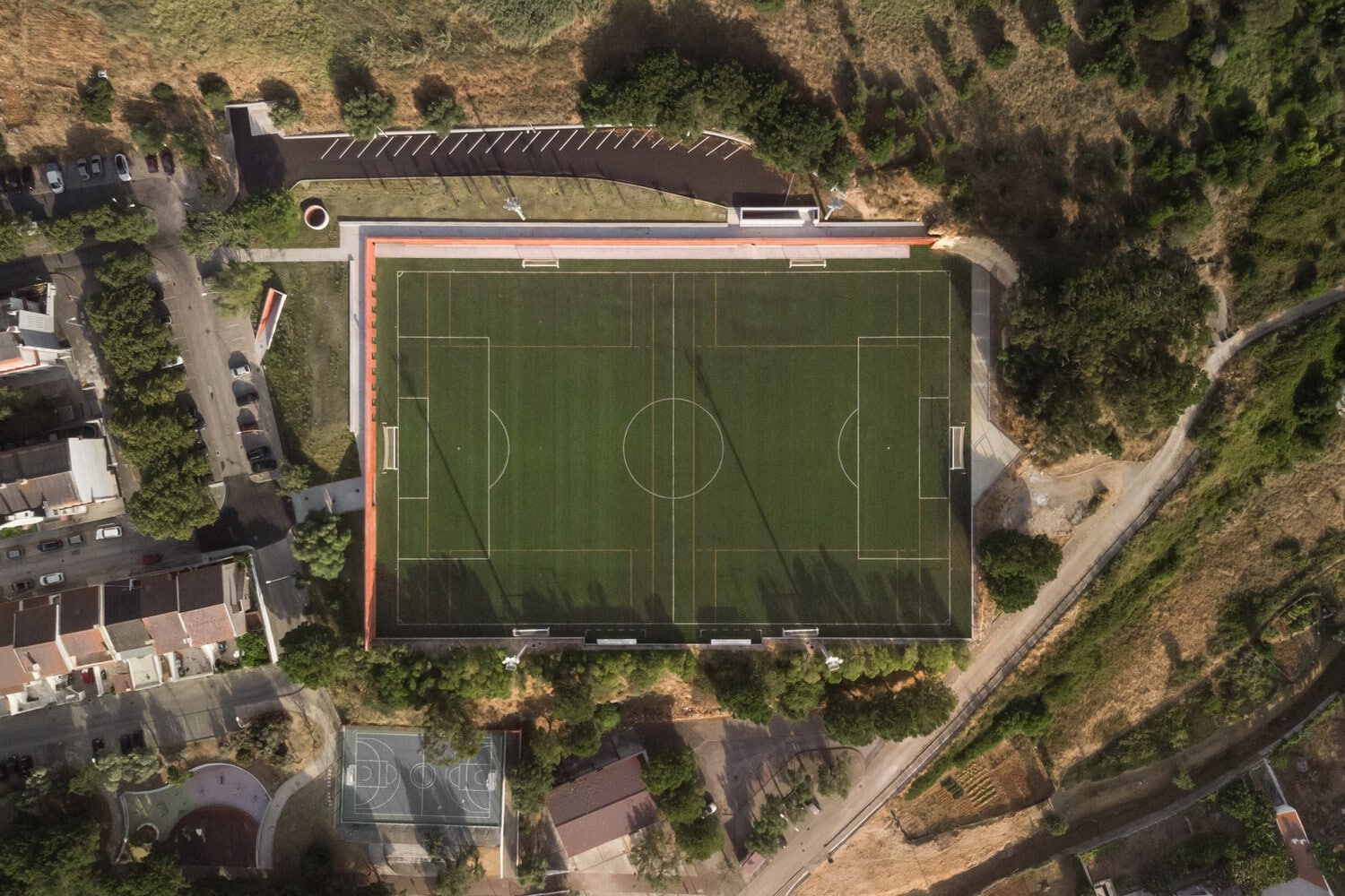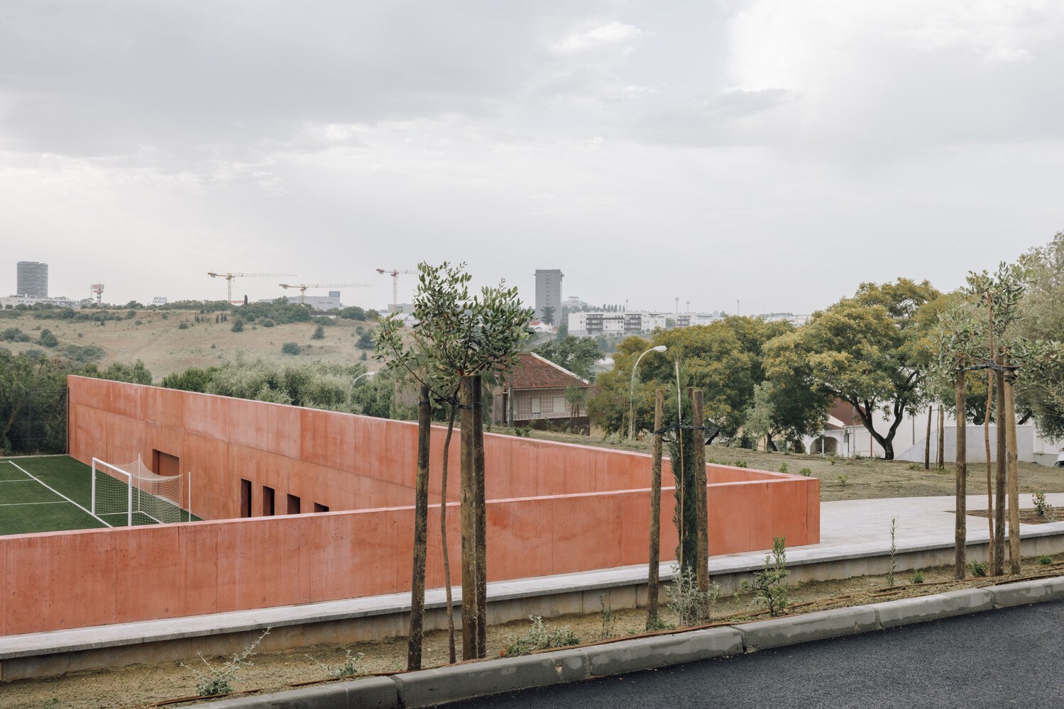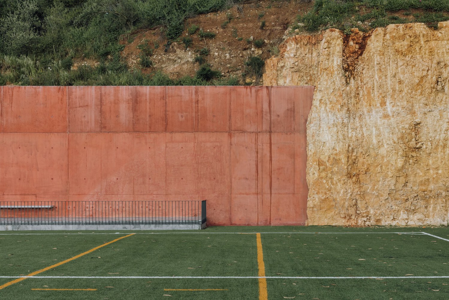 Marcelino’s approach is rooted in the belief that architecture should reveal, not dominate, its surroundings. Rather than imposing a conventional sports facility on the slope, the design subtly redefines the ground itself. The retaining wall, built of reinforced concrete tinted with iron oxide, appears as a natural extension of the rocky hillside, giving the impression that the field has always belonged to the site.