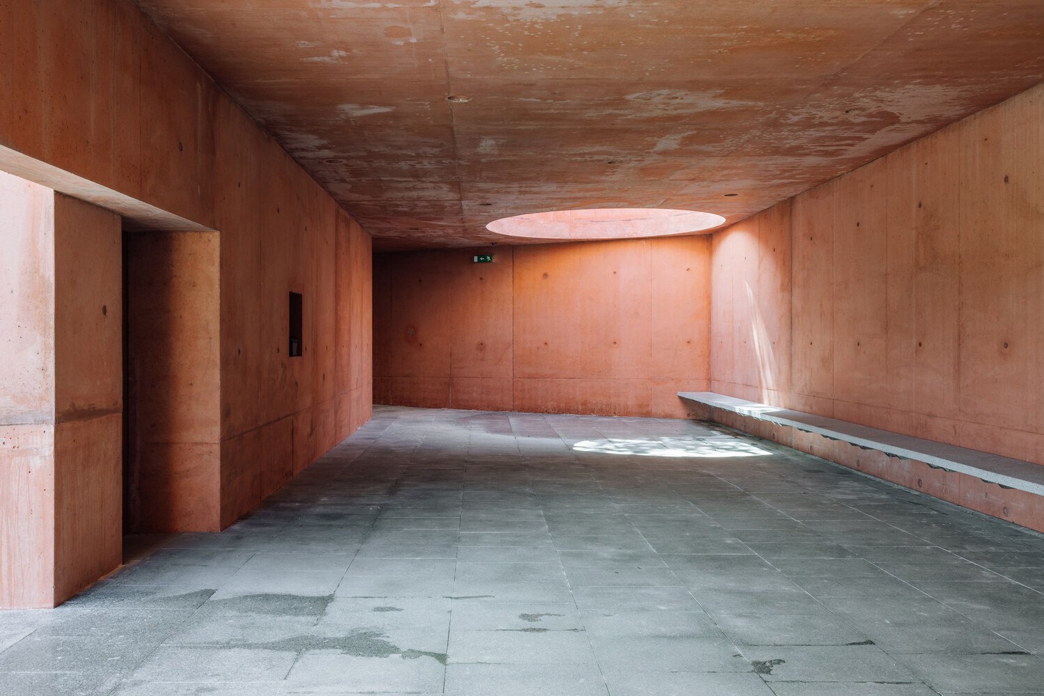 At the base, the ramp opens into a covered atrium that serves as the main entrance. This semi-enclosed space connects directly to the arcade formed by the retaining wall, offering shelter, shade, and access to the support facilities hidden underground. The architectural sequence culminates in a continuous bench that runs along the wall — a minimalist yet generous gesture that allows spectators to sit close to the action.