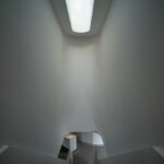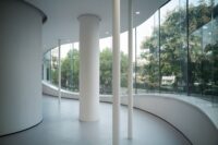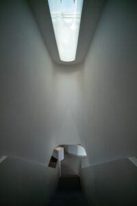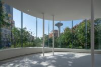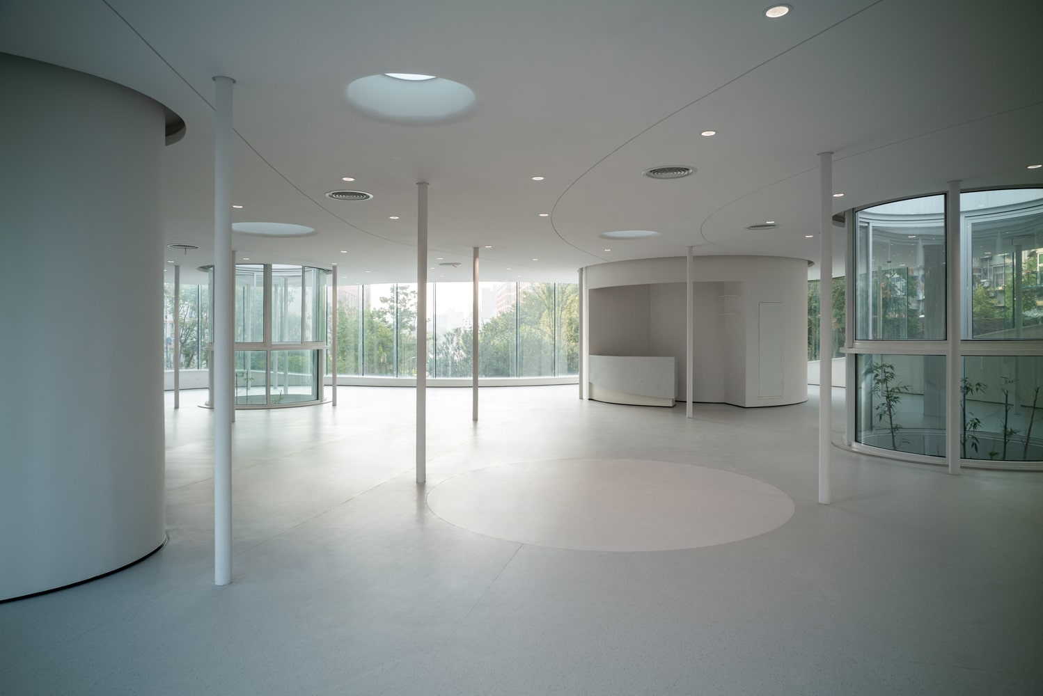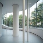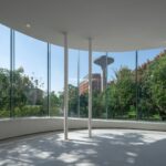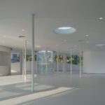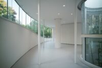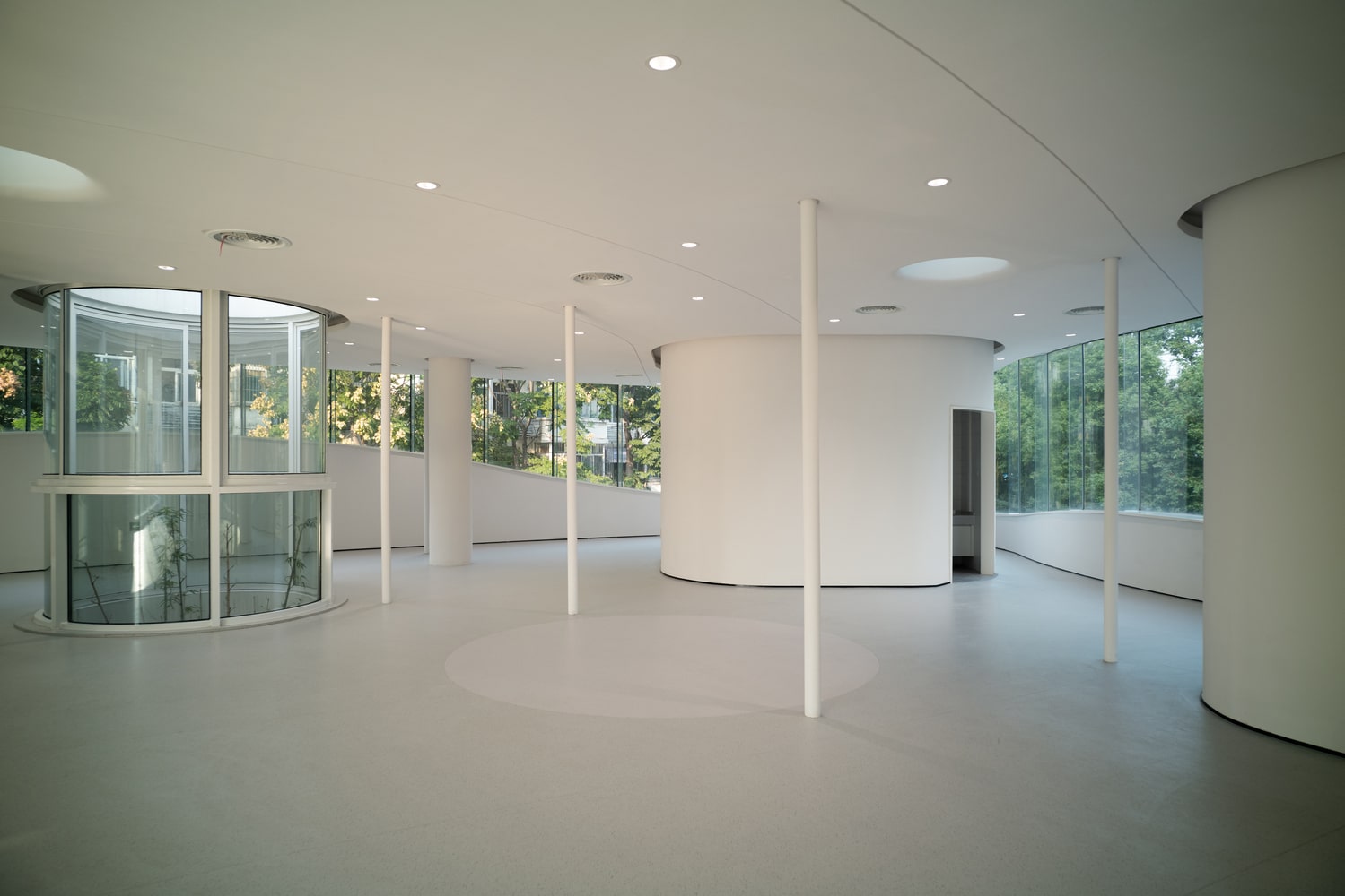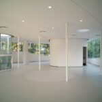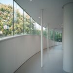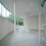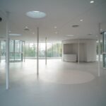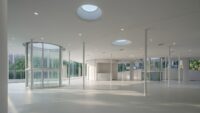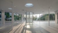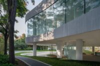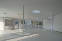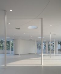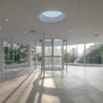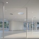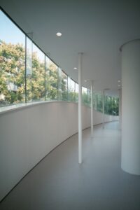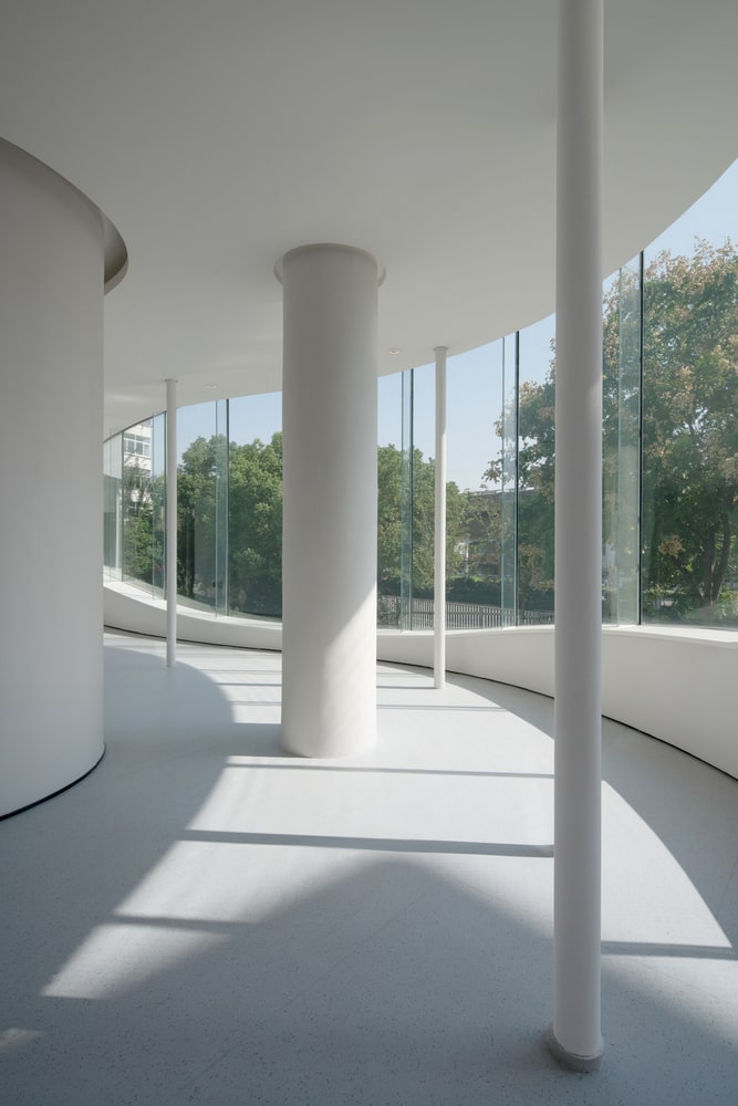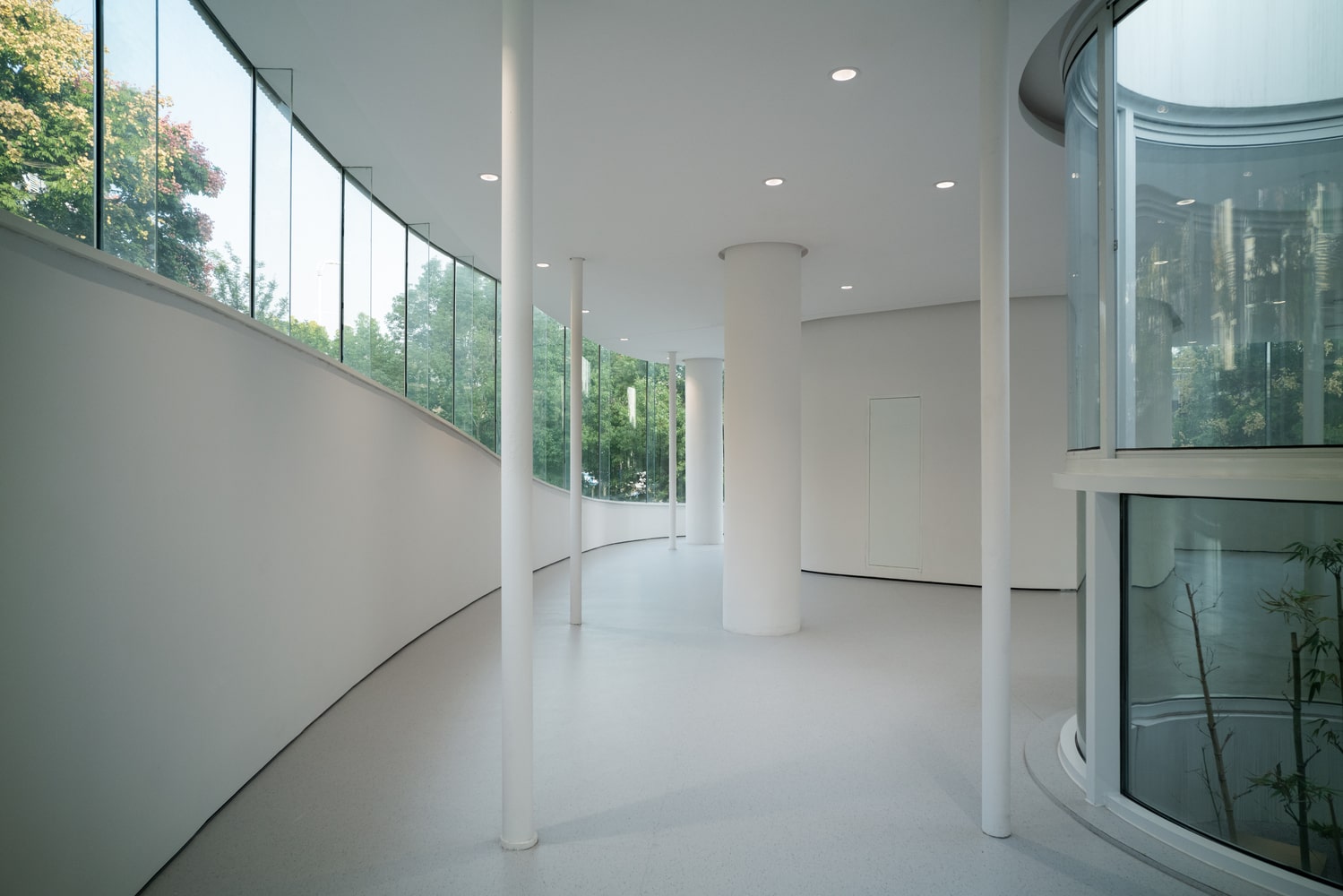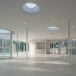 Two vertical light wells punctuate the second floor, introducing natural daylight and ventilation while satisfying fire safety regulations. The continuous glass façade divides the upper level into two zones, offering panoramic views of both the urban environment and the campus greenery. By blending structural necessity with spatial clarity, the architects ensure that daylight and views permeate the interior, enhancing comfort and user experience.