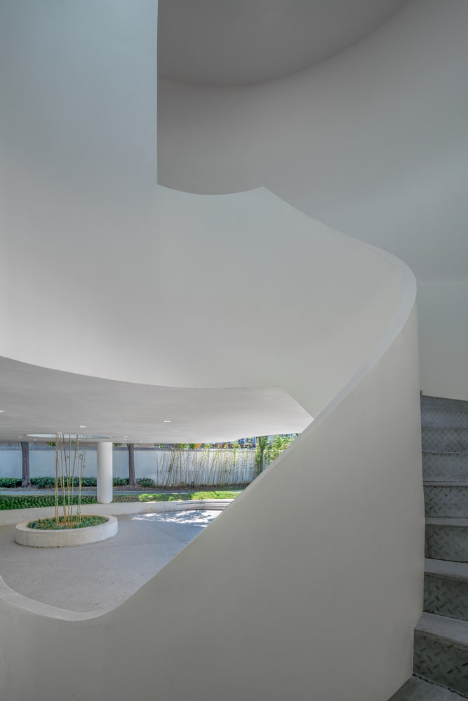 The building’s curved footprint generates dynamic spatial experiences along the site boundary, improving visual and physical fluidity. Elevated above the ground, the structure functions as a large pavilion, allowing pedestrians to pass beneath it while maintaining a clear connection between the city road and the campus. The slightly sunken ground below forms an informal gathering space, accommodating outdoor activities, spontaneous seating, and student interaction. Surrounded by greenery, the pavilion-like structure introduces a sense of openness and transparency uncommon in conventional campus buildings.