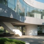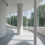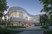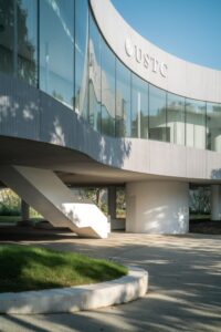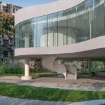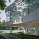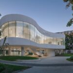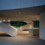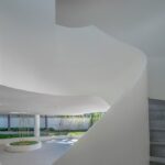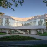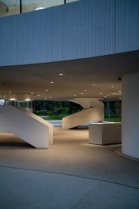 From the exterior, the building communicates a sense of movement and lightness. Elevated above the site, it serves as a visual beacon along the campus axis, with its illuminated interiors highlighting student activity at night. The curved form, transparent glazing, and careful integration with surrounding greenery create a structure that is at once functional, sculptural, and contextually responsive.