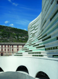 The new campus reflects MCA’s commitment to architecture that collaborates with landscape and climate. Inspired by the image of an iceberg, the design establishes a strong visual and environmental dialogue with the snow-capped peaks of the surrounding Alps. The faceted forms and shimmering tones of the new buildings evoke the crisp, reflective surfaces of ice, providing a striking counterpoint to the historic masonry of the existing barracks.